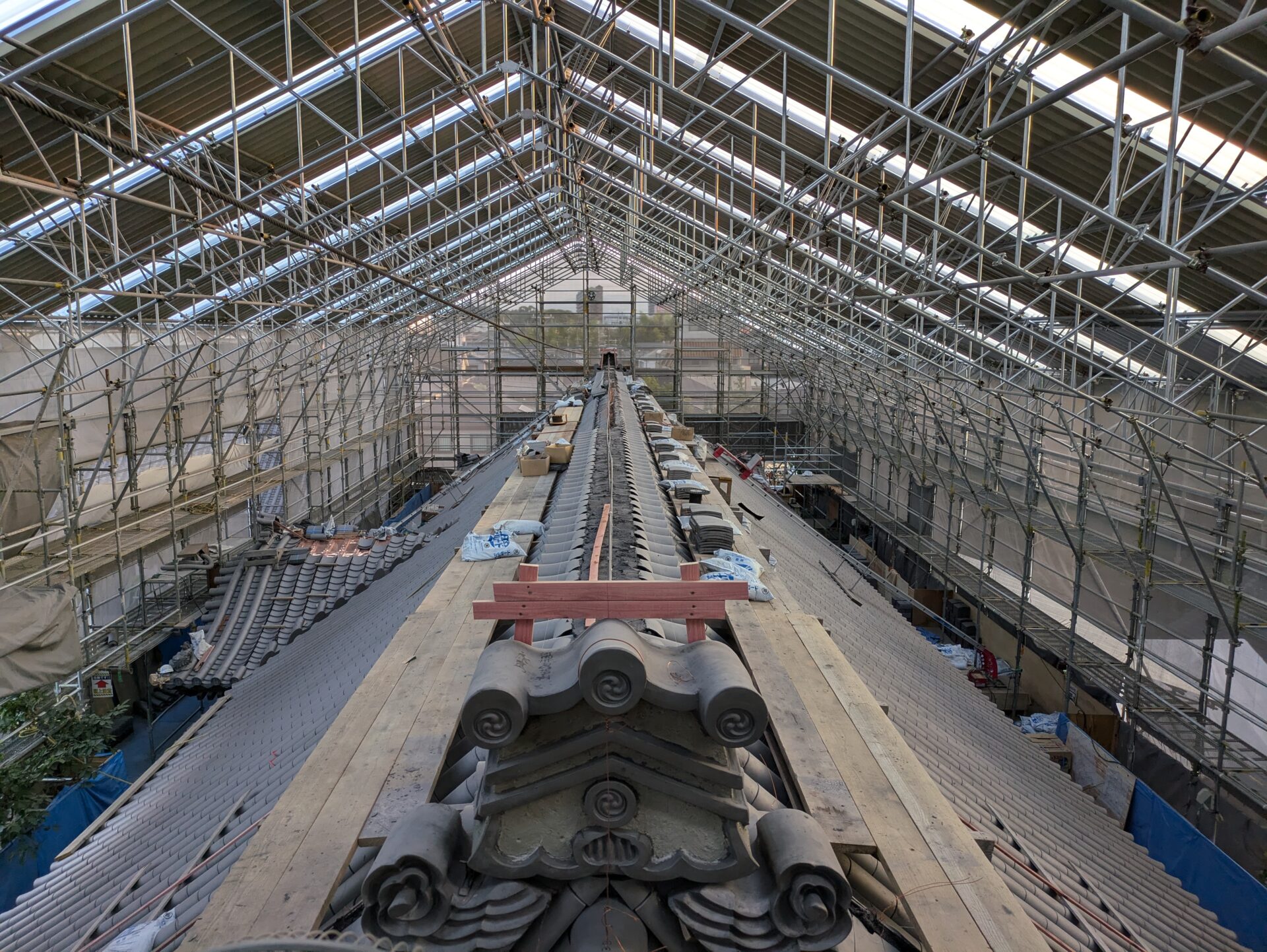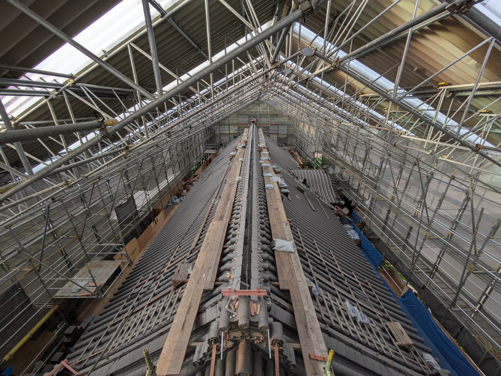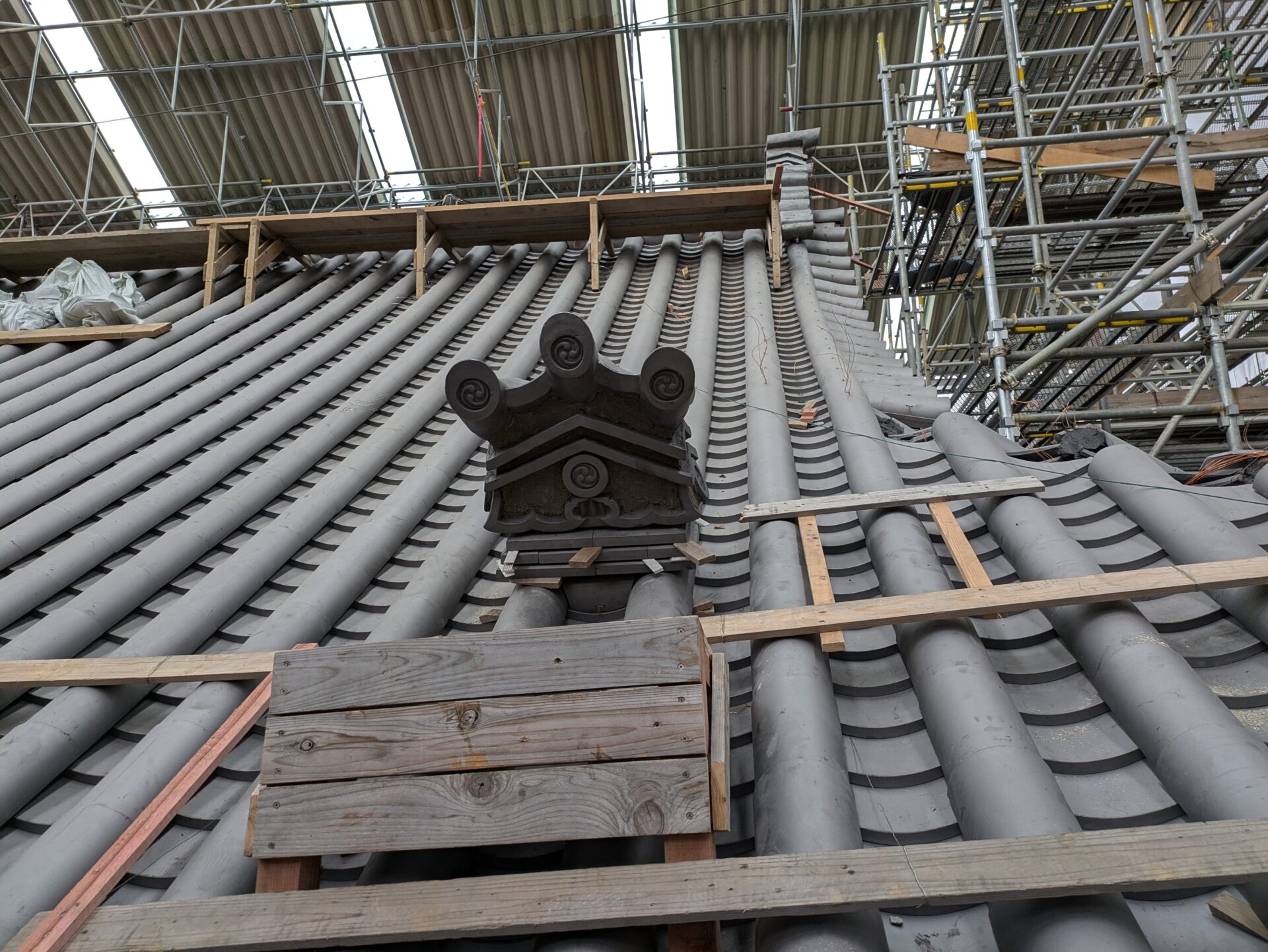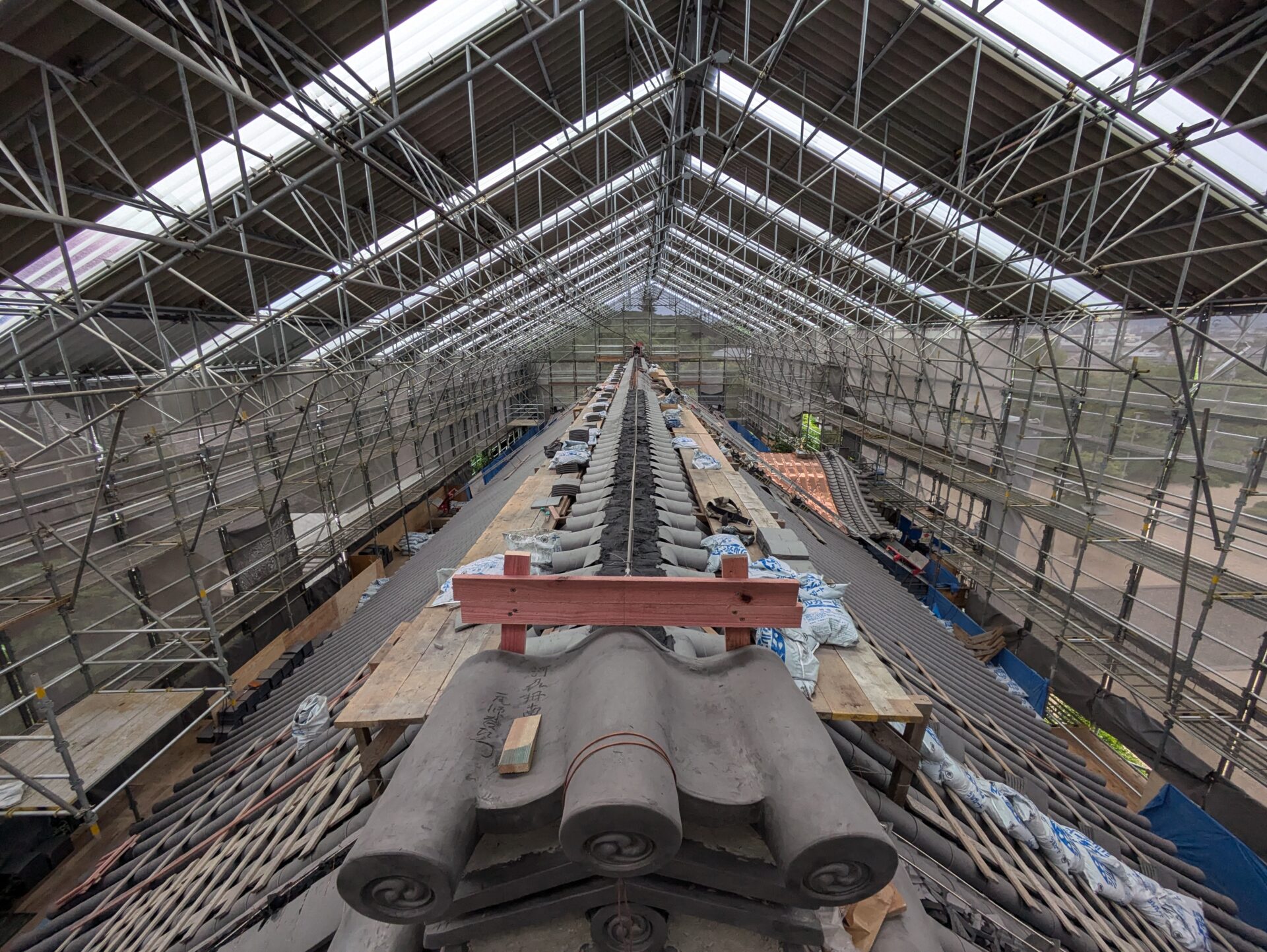 16日に確認すると向拝の部分が完成し、大棟もだいぶん積みあがってきました。熨斗瓦は、くさびを使って、微妙に角度を調整し、小菊瓦の一枚一枚にシートを挟み隙間を均等にしているようです。大変根気のいる作業ですね。