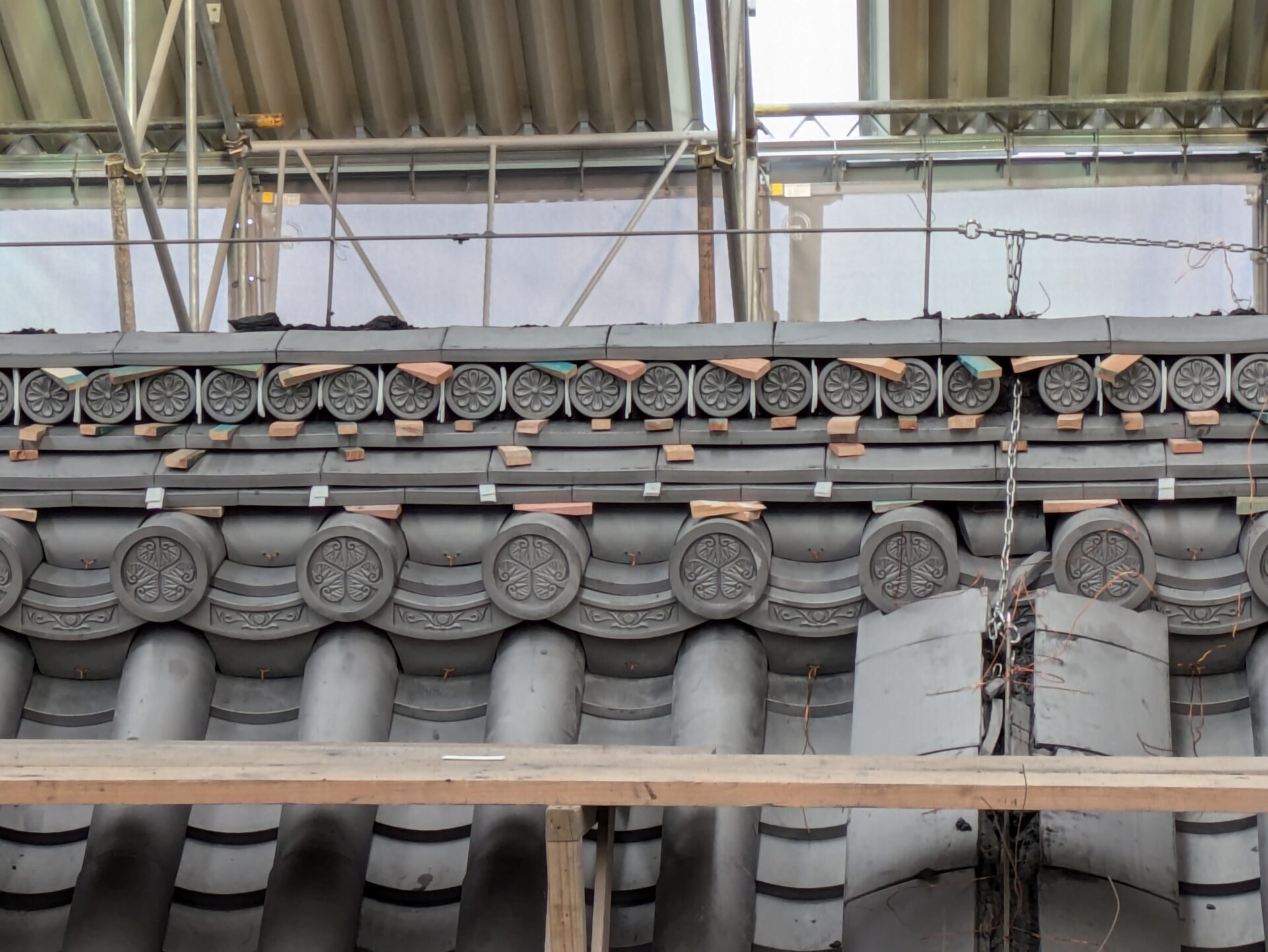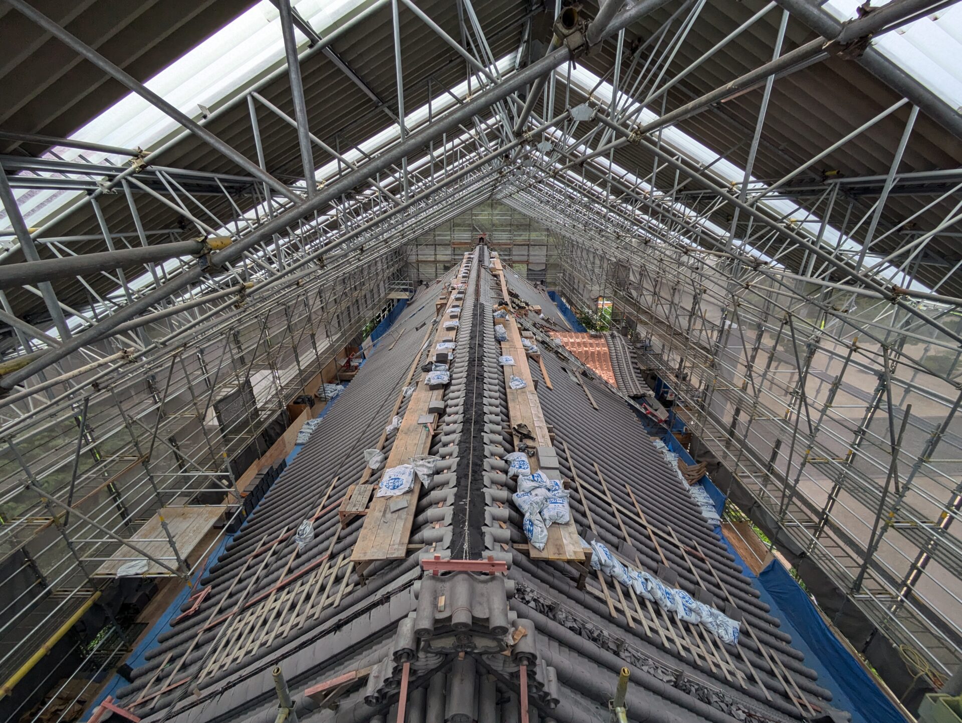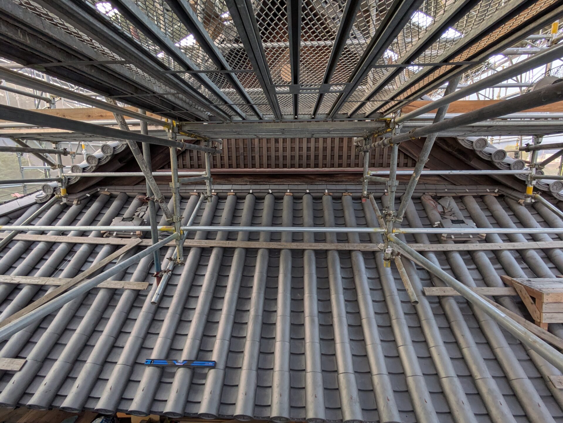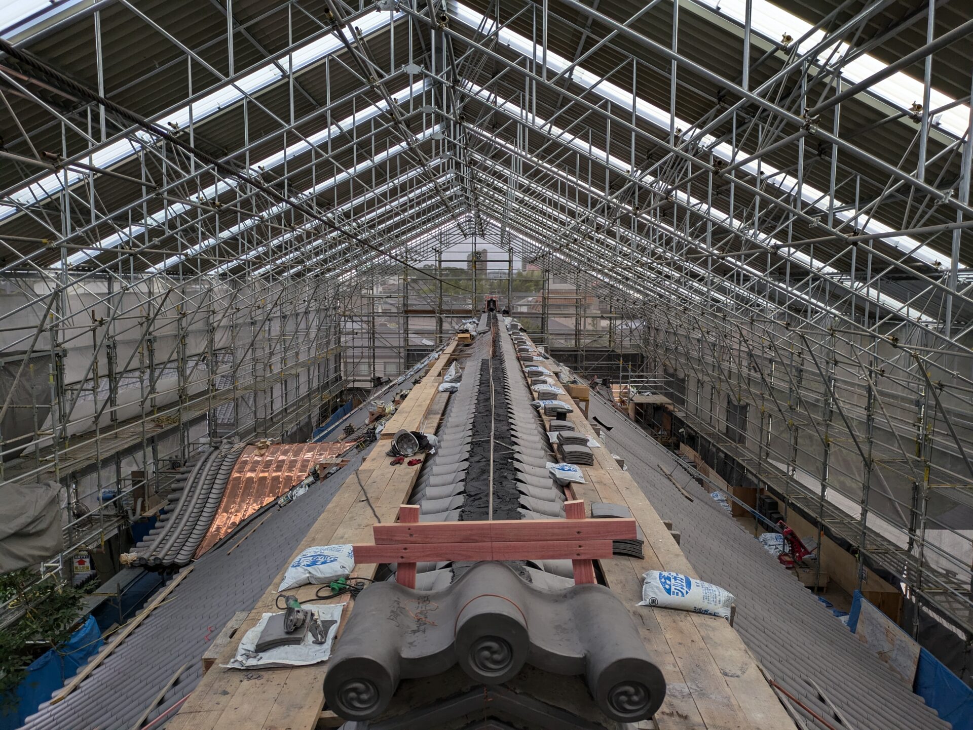 16日に確認すると向拝の部分が完成し、大棟もだいぶん積みあがってきました。熨斗瓦は、くさびを使って、微妙に角度を調整し、小菊瓦の一枚一枚にシートを挟み隙間を均等にしているようです。大変根気のいる作業ですね。