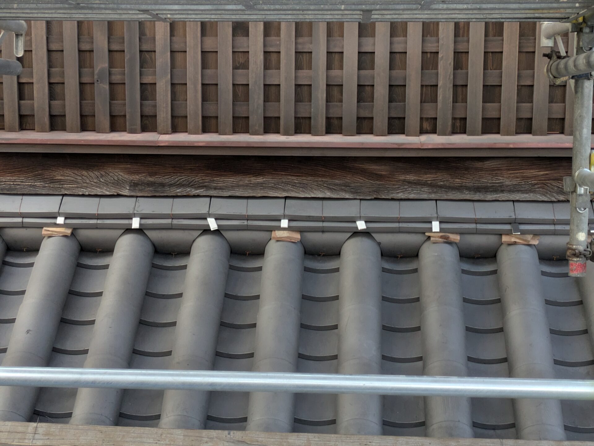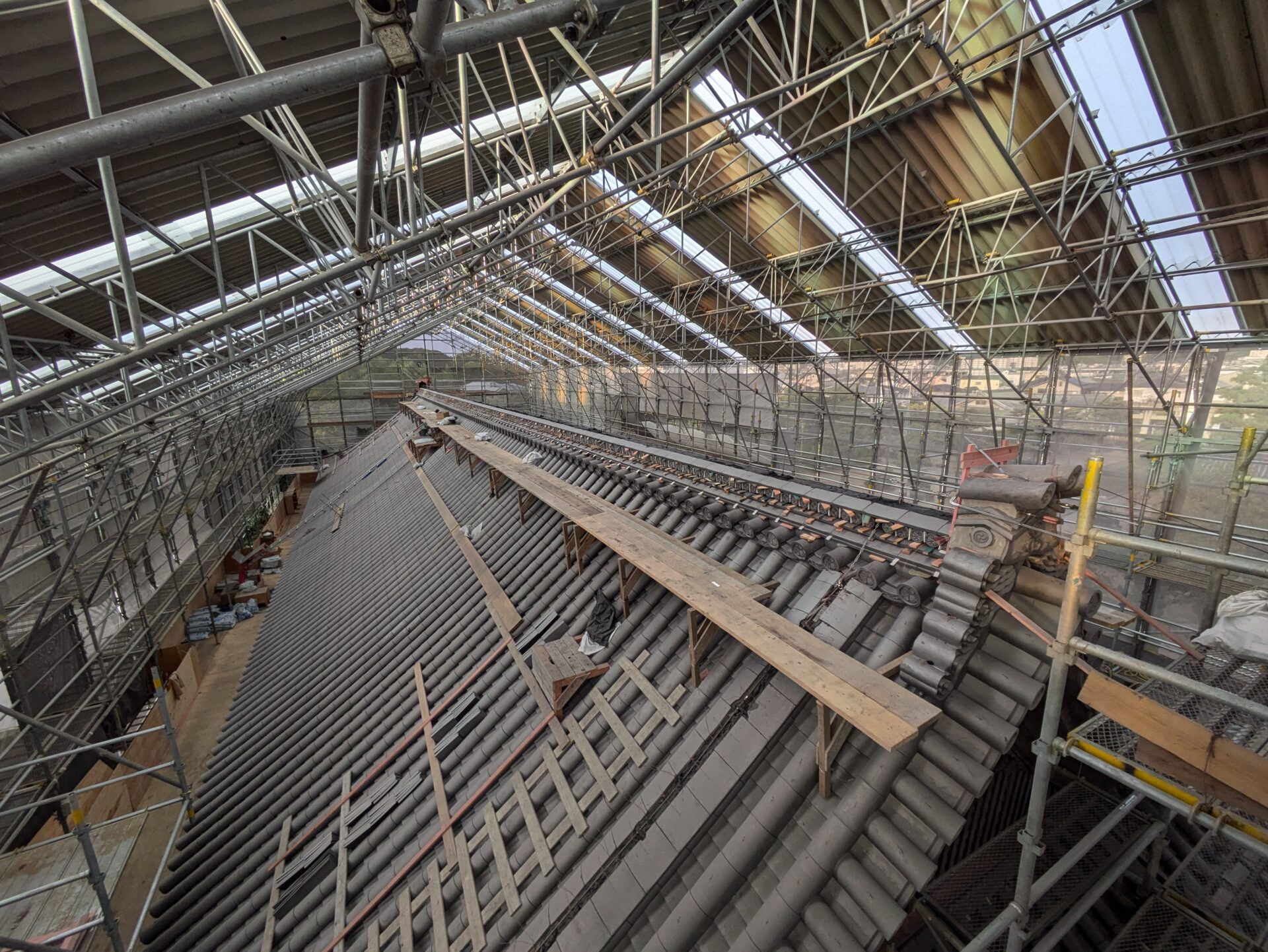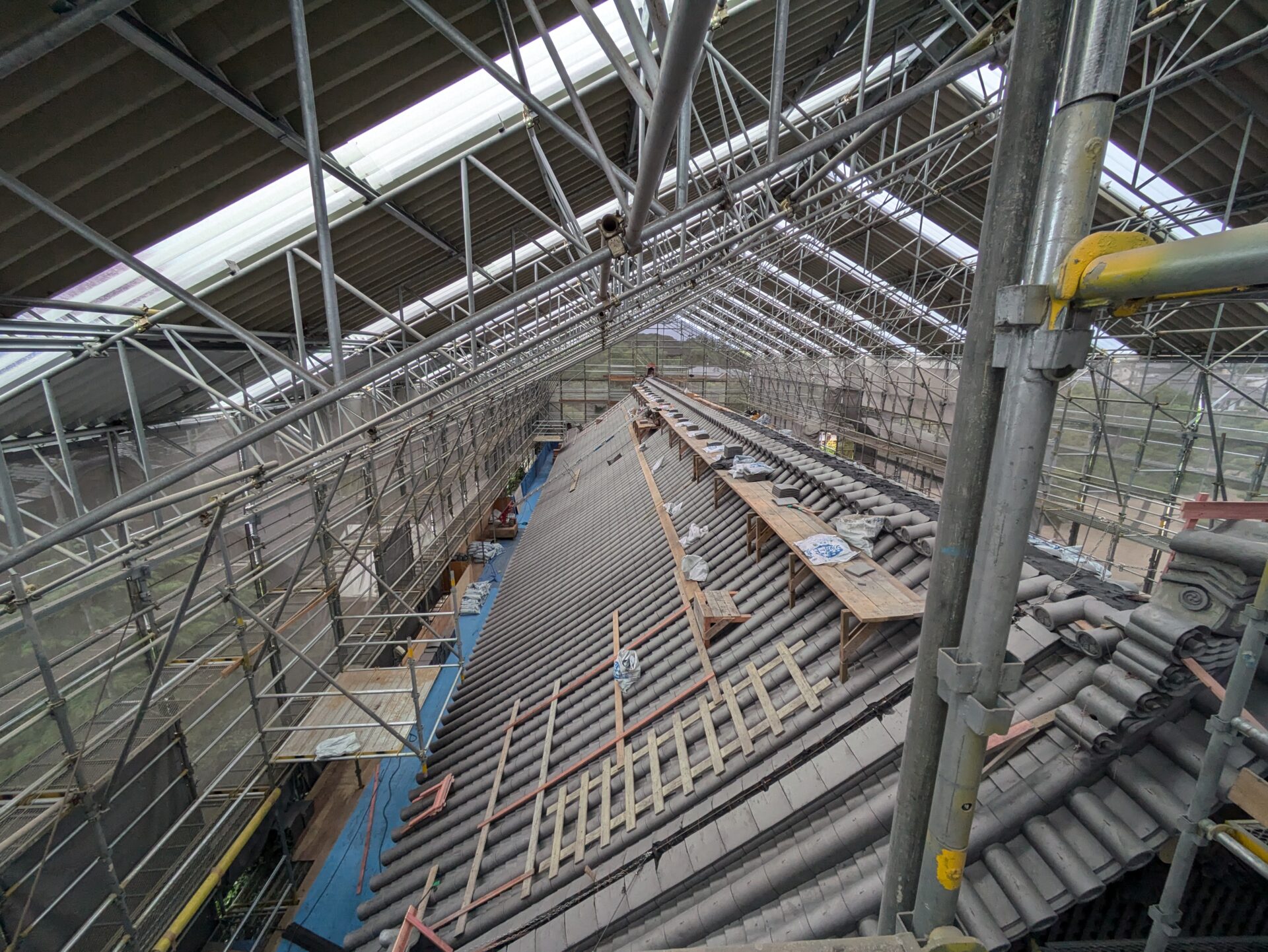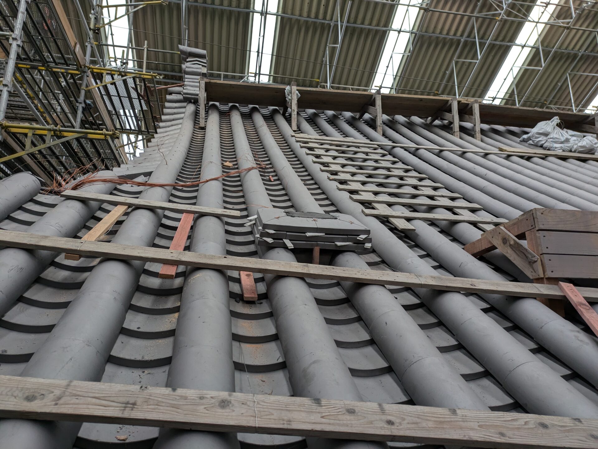 16日に確認すると向拝の部分が完成し、大棟もだいぶん積みあがってきました。熨斗瓦は、くさびを使って、微妙に角度を調整し、小菊瓦の一枚一枚にシートを挟み隙間を均等にしているようです。大変根気のいる作業ですね。