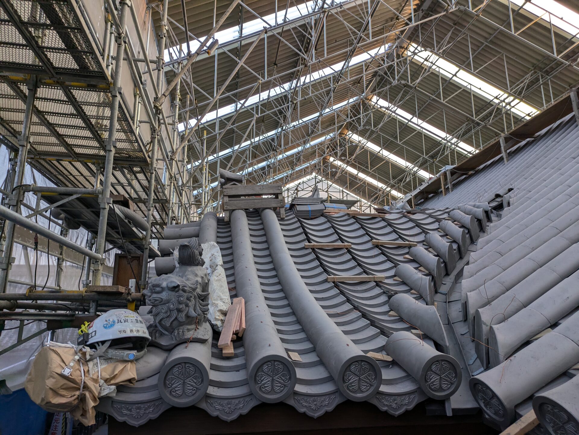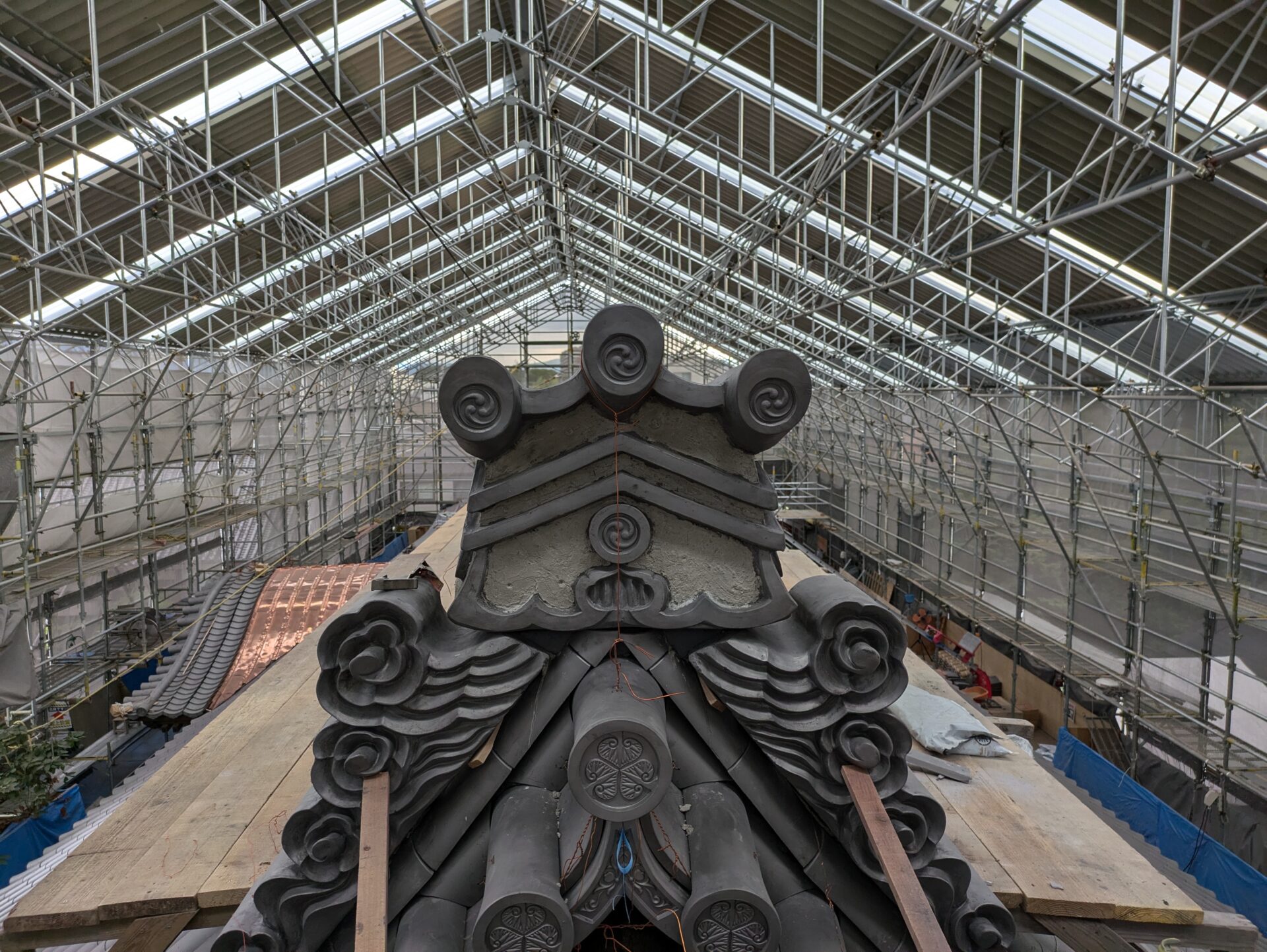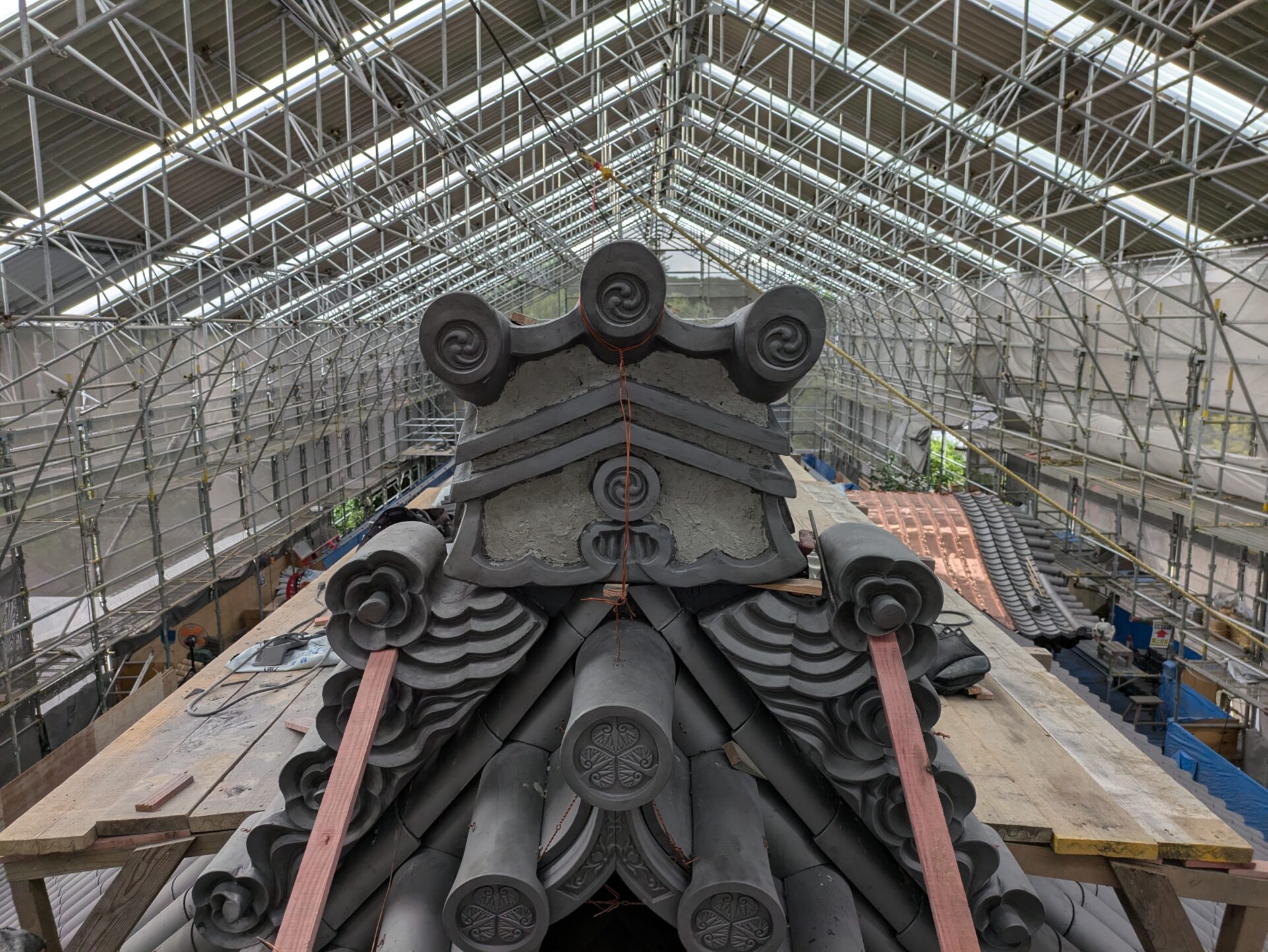 8月25日 拝殿東側丸瓦・向拝部分の設置、鬼瓦の設置と大棟瓦の設置開始