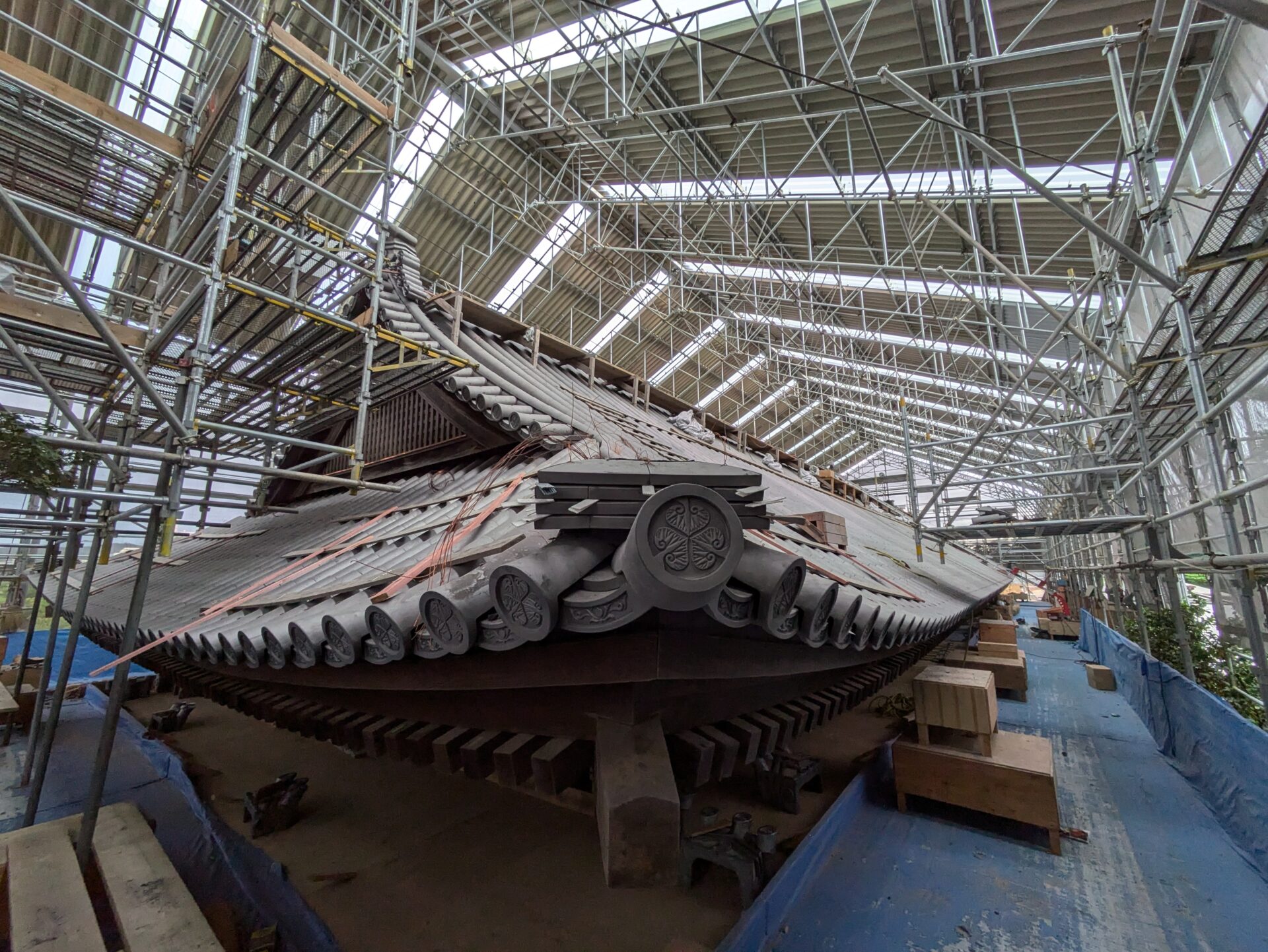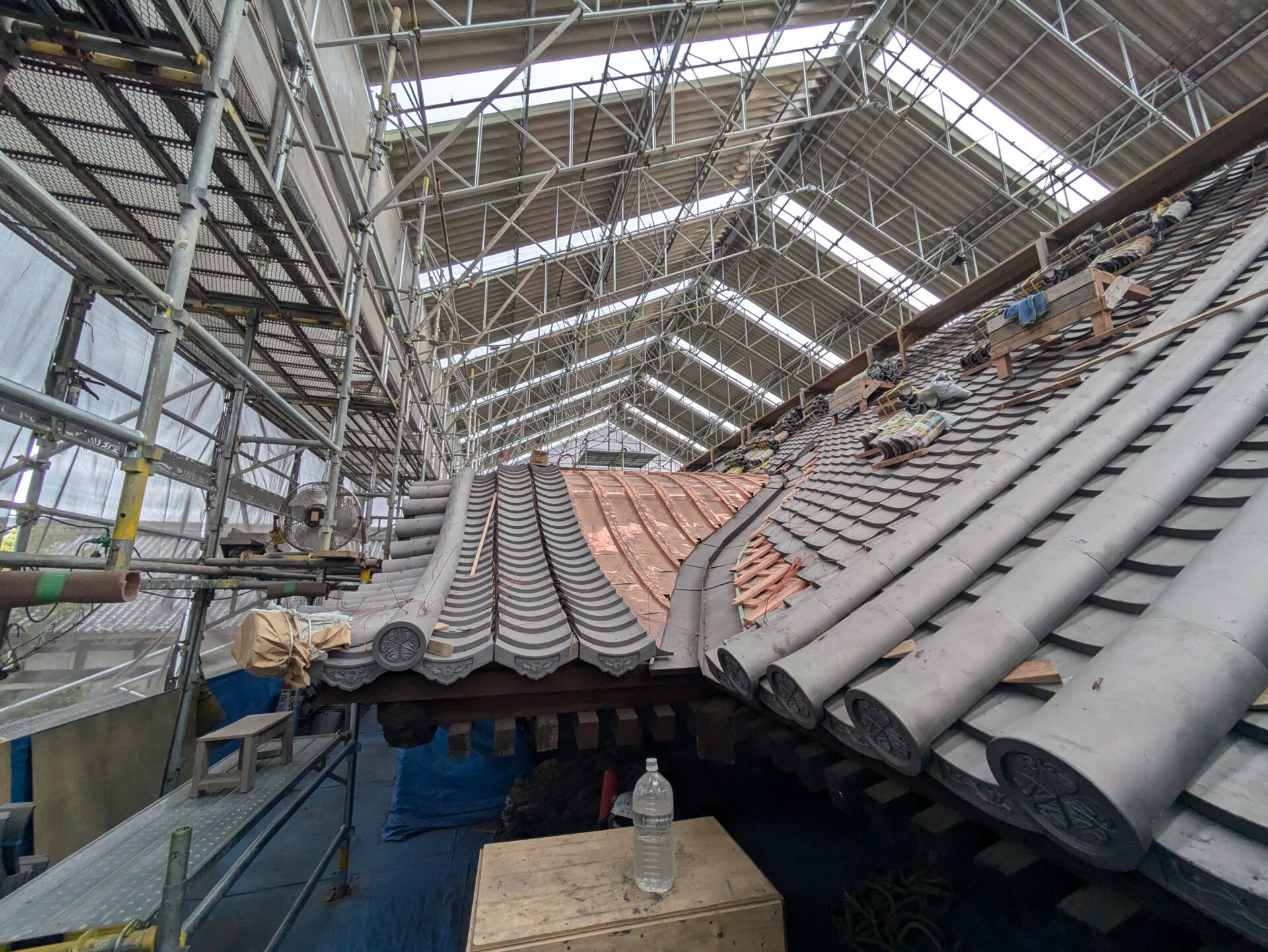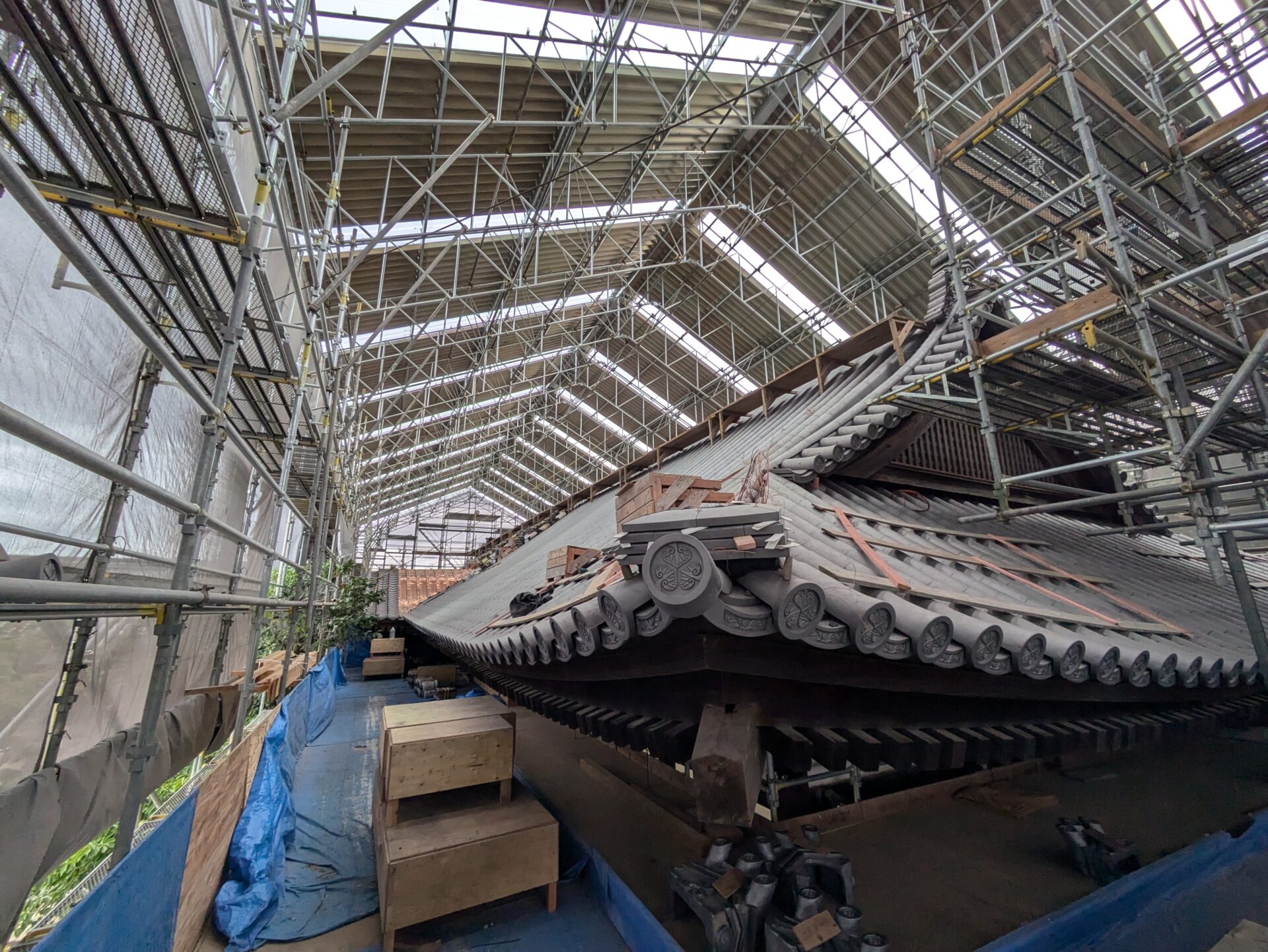 8月25日 拝殿東側丸瓦・向拝部分の設置、鬼瓦の設置と大棟瓦の設置開始