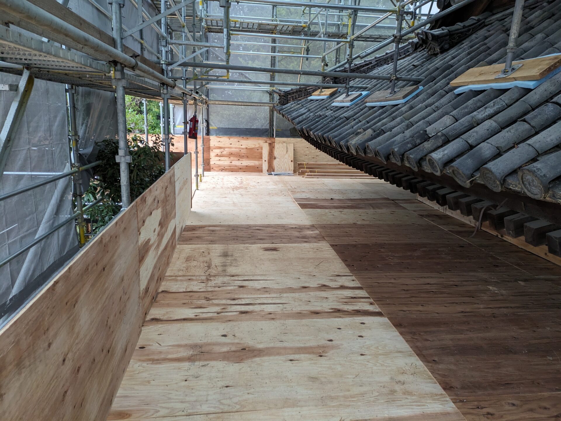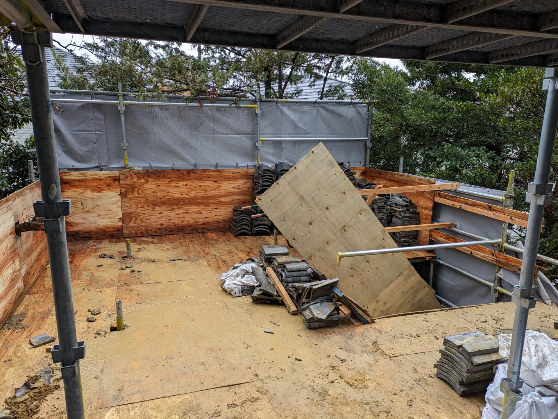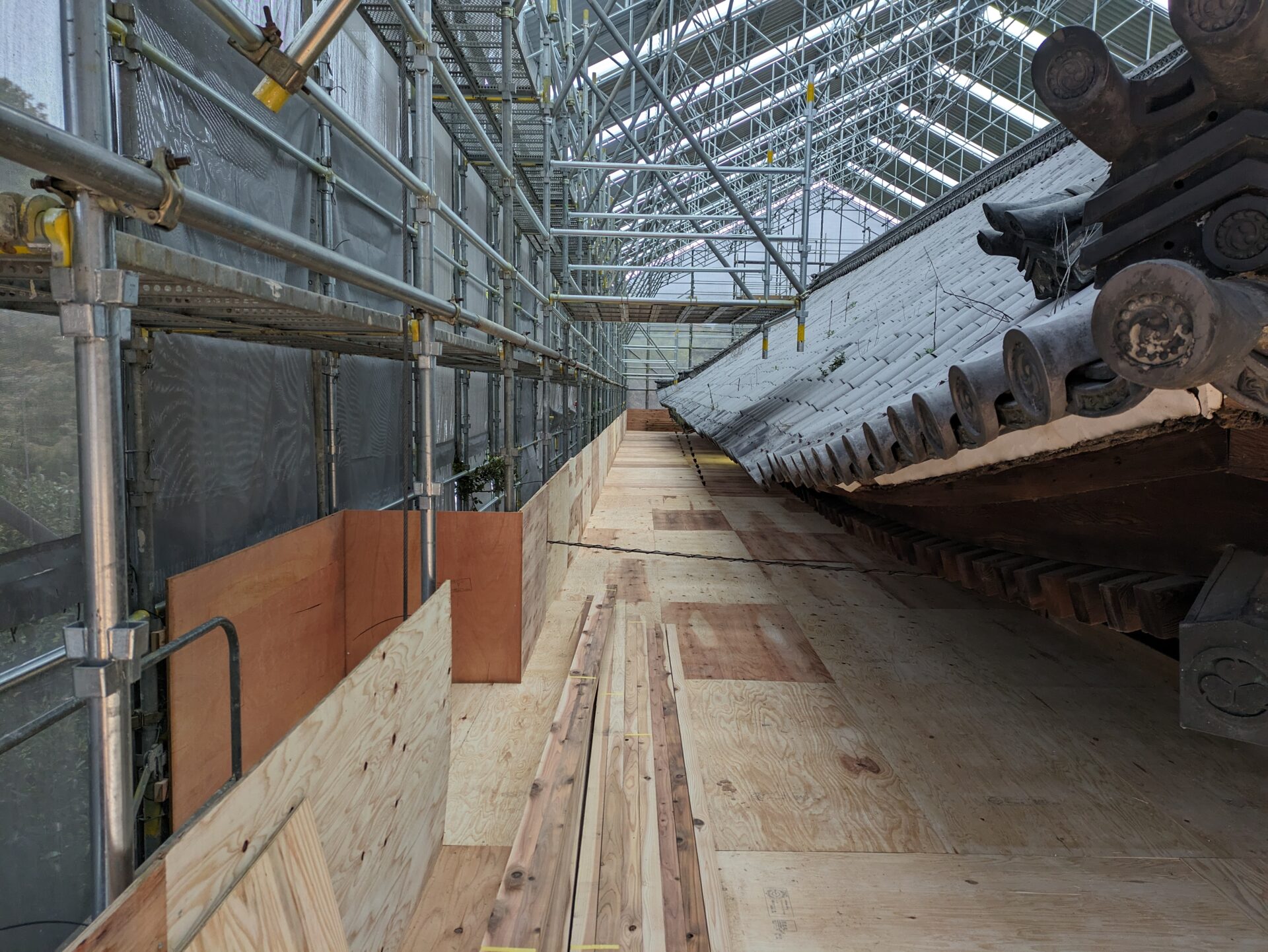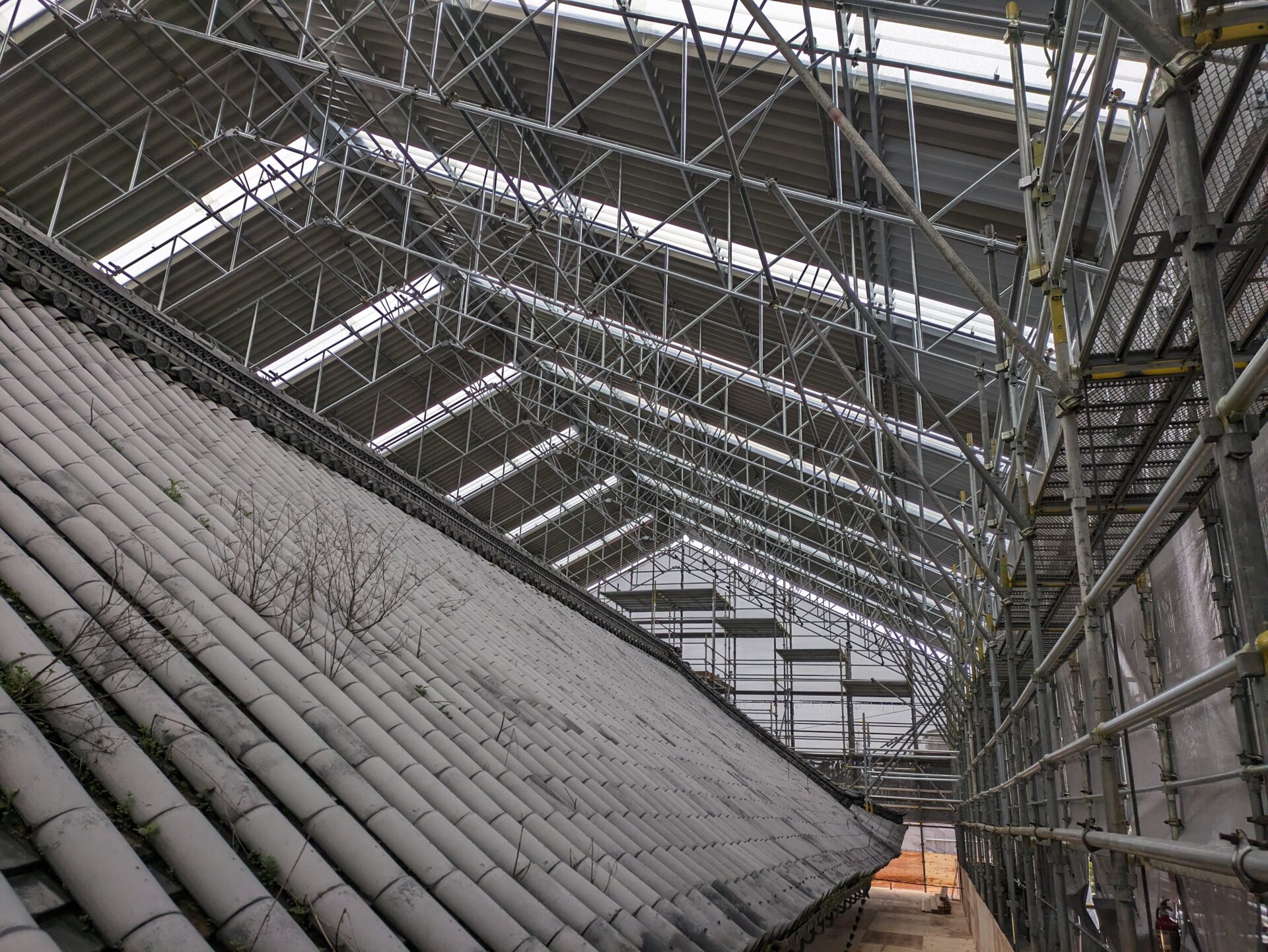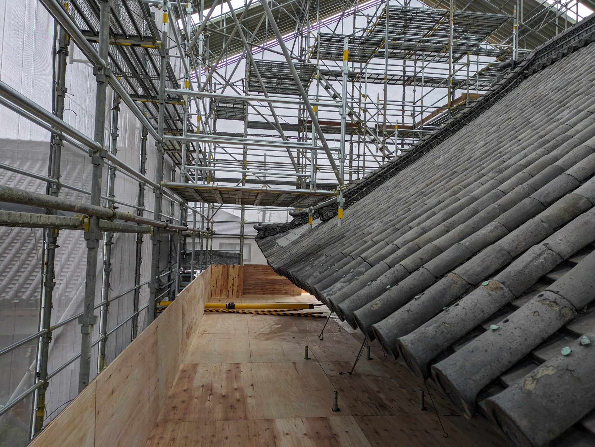 足場が完成し、ここから、瓦・瓦を固定している土の撤去に移っていきます。