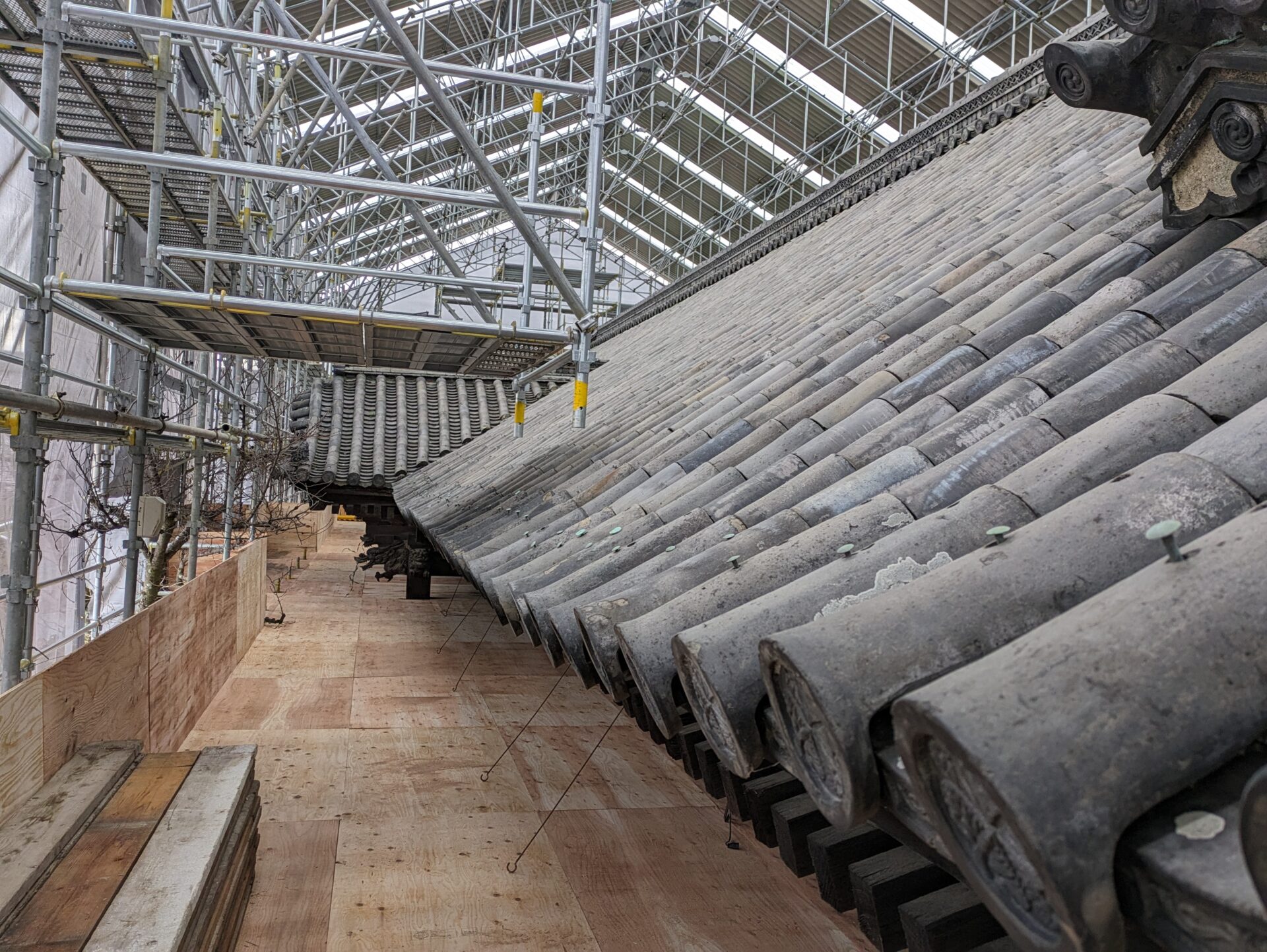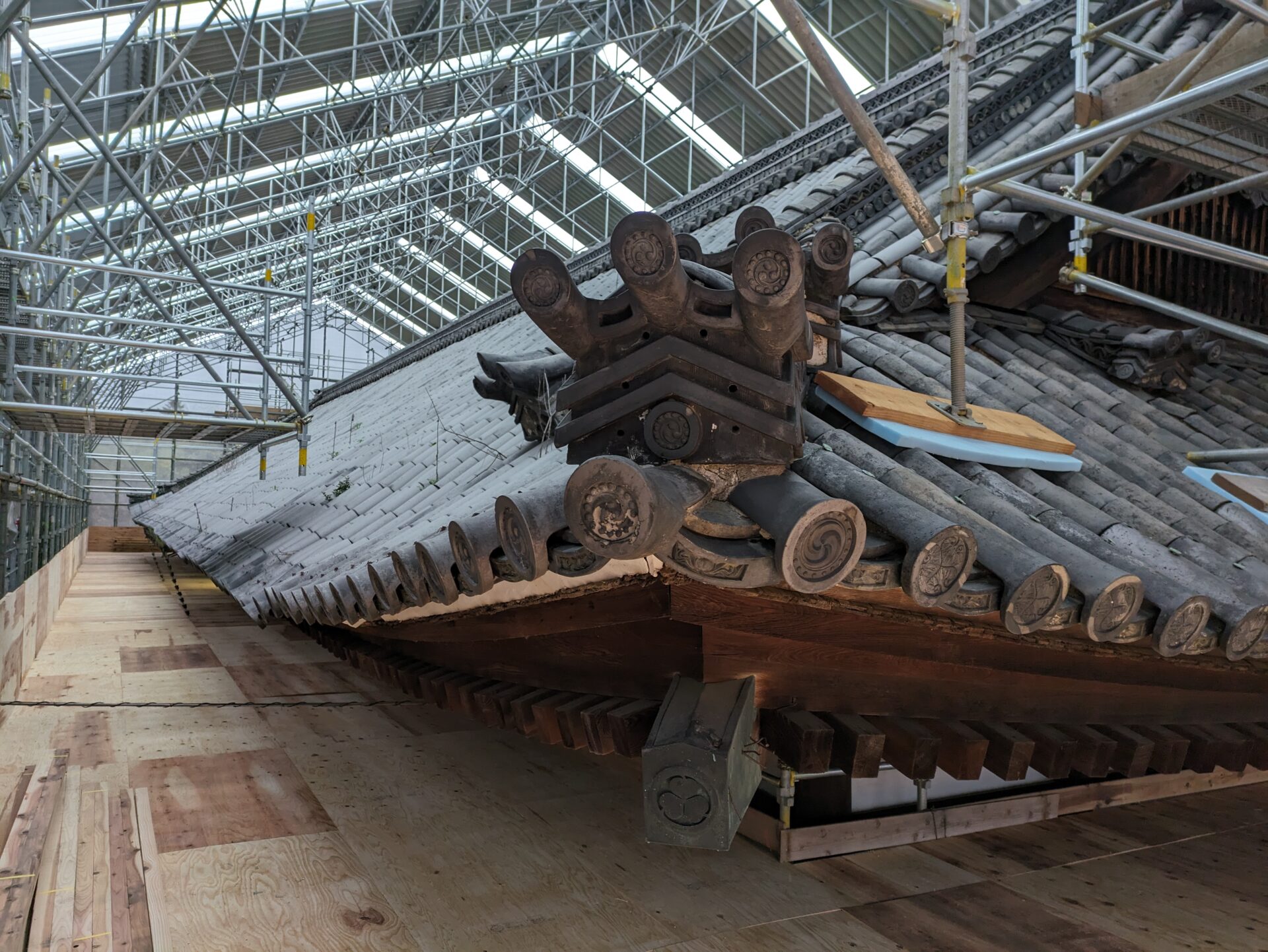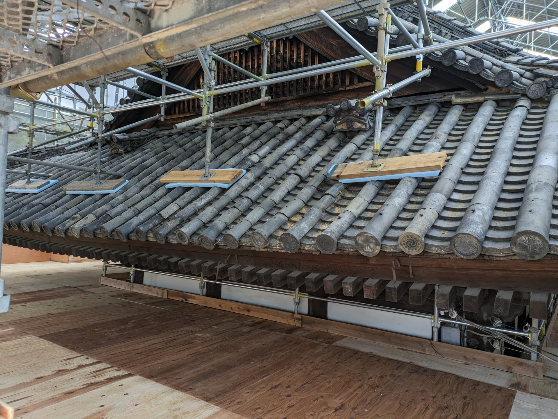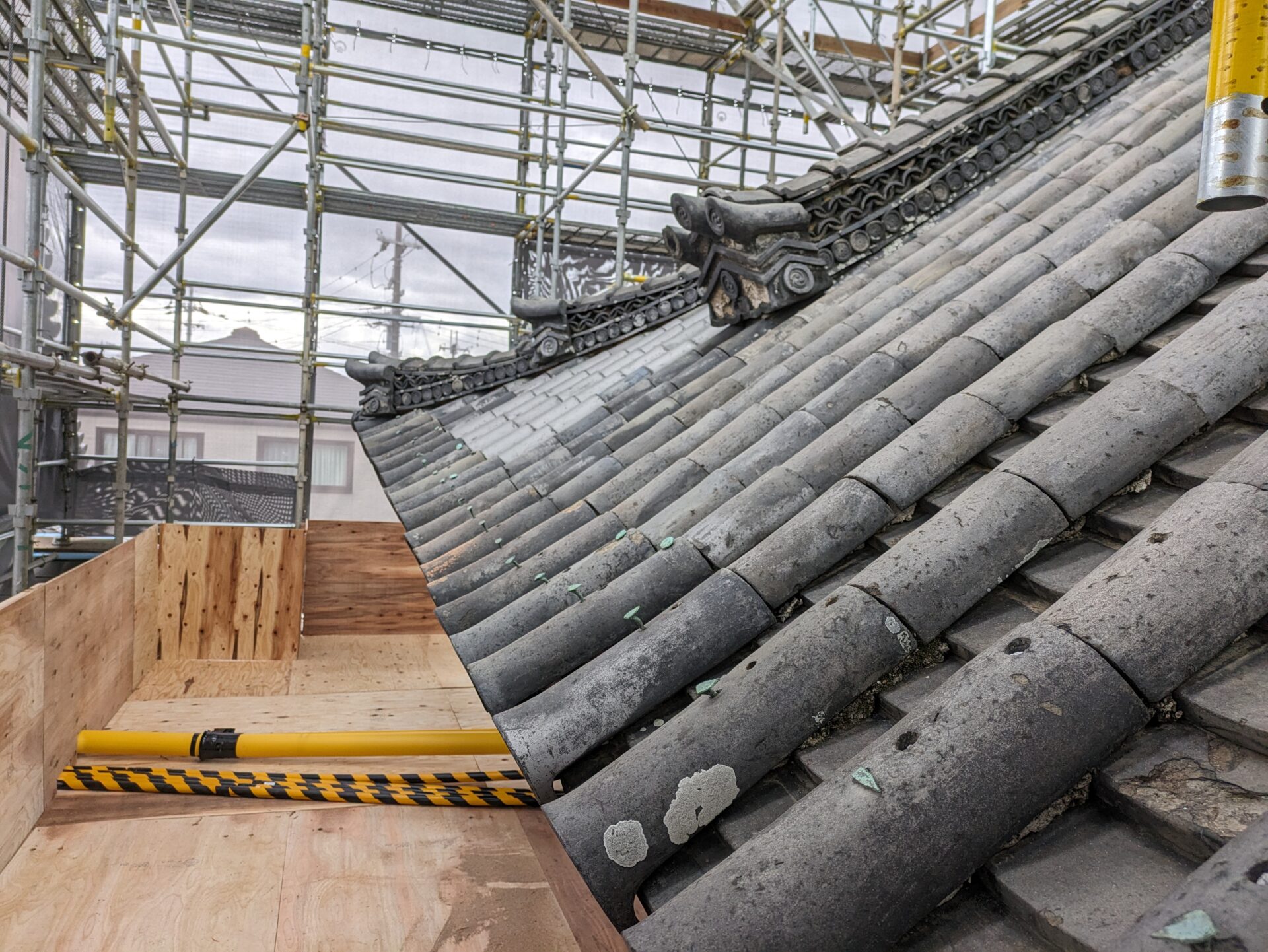 足場が完成し、ここから、瓦・瓦を固定している土の撤去に移っていきます。