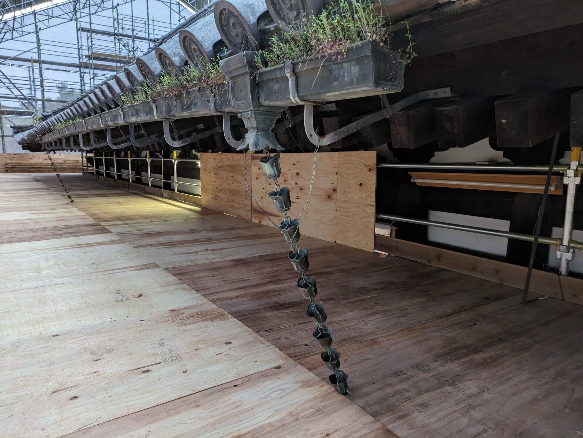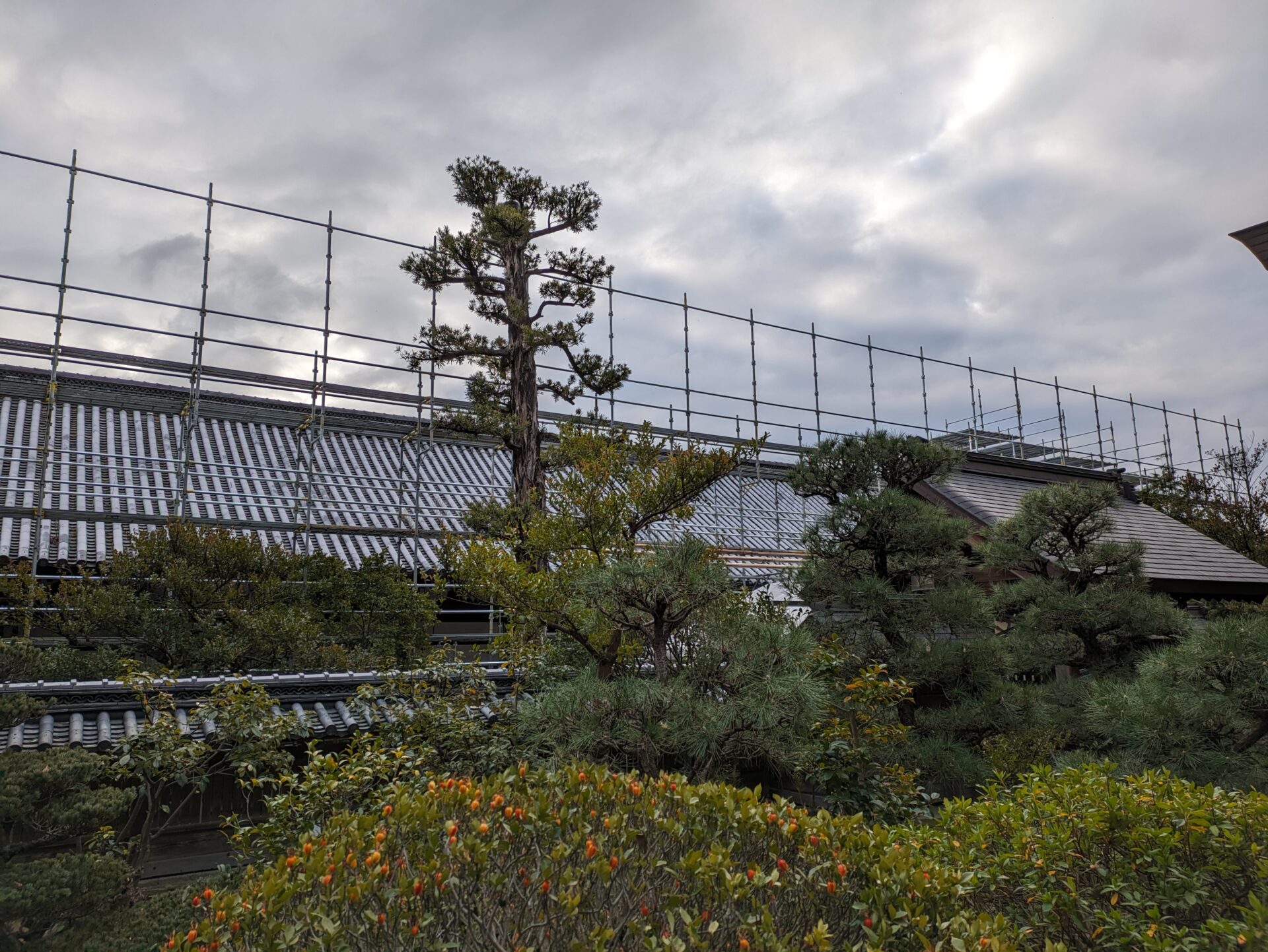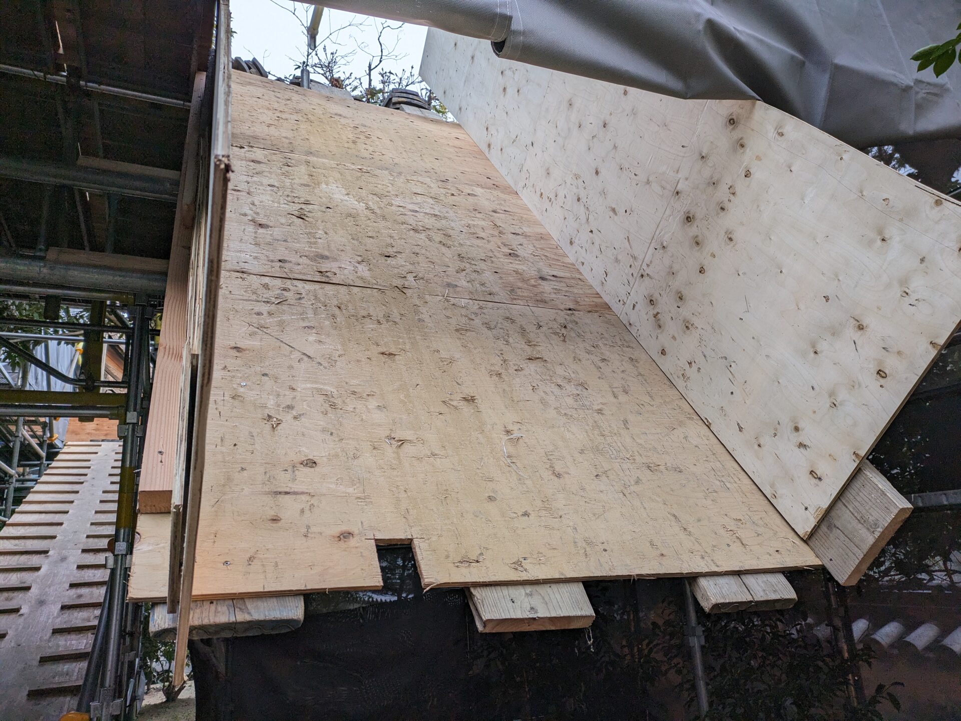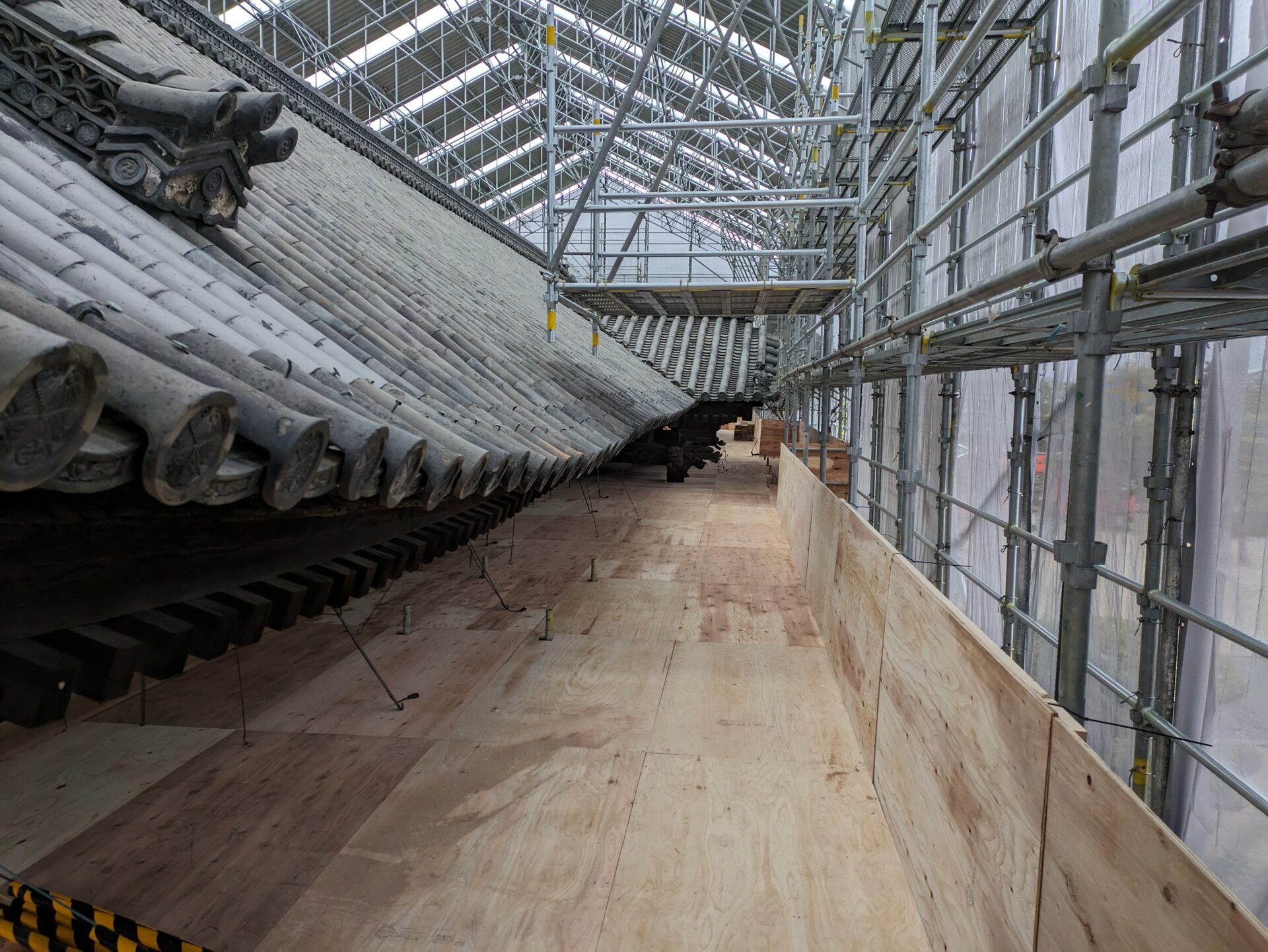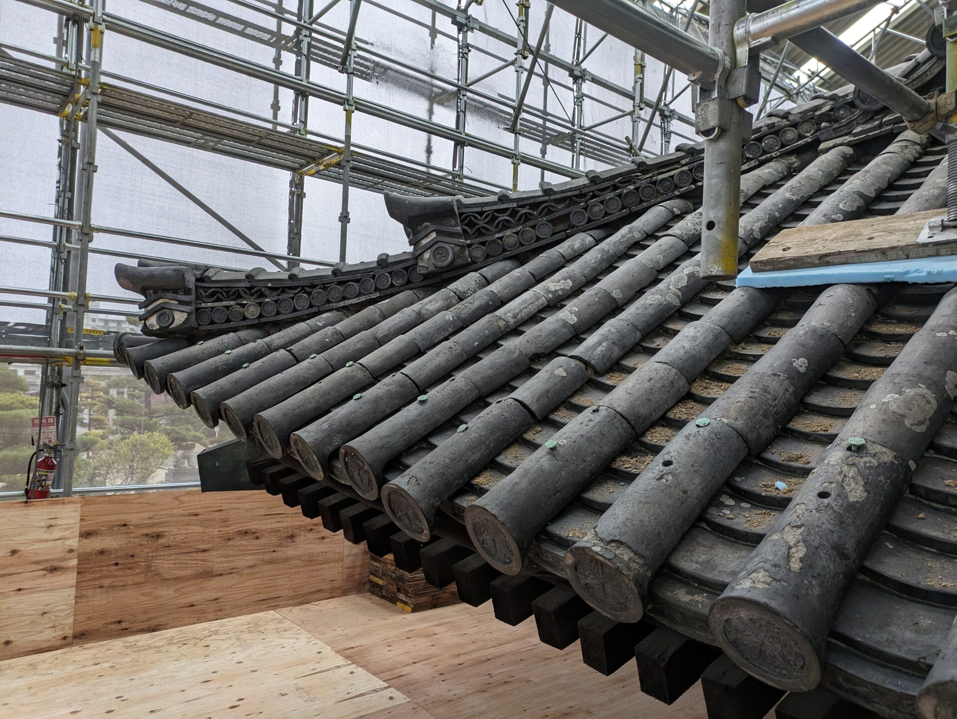 足場が完成し、ここから、瓦・瓦を固定している土の撤去に移っていきます。