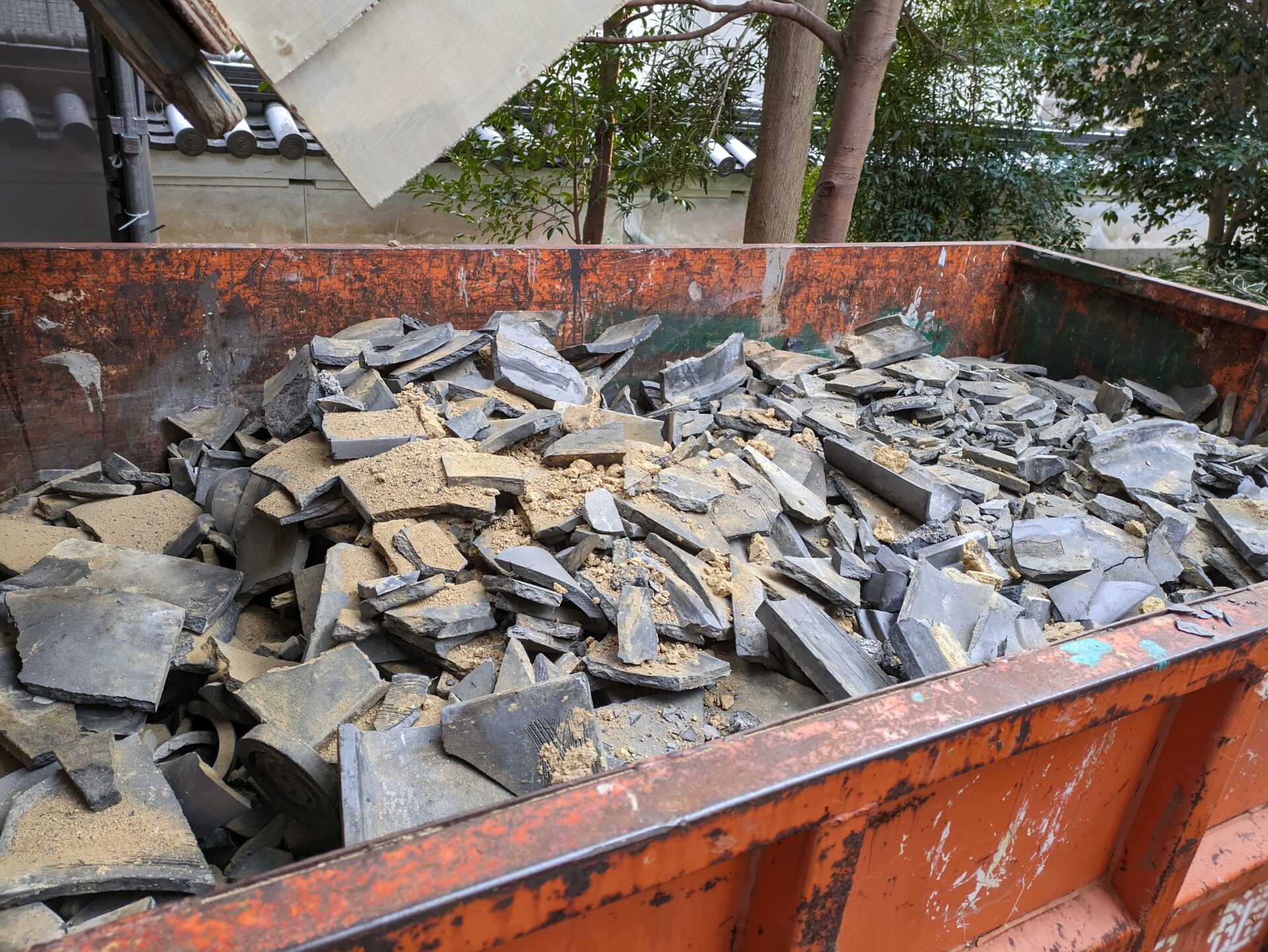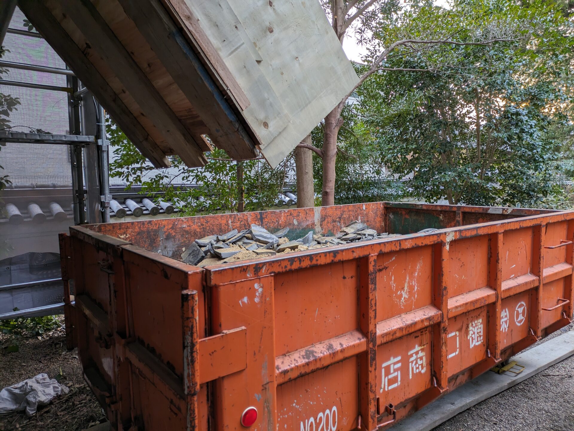 南側本殿寄りに滑り台が設置された踊り場が設けられており、こちらに廃材を集めこちらから、廃材回収のコンテナに滑らせて満タンになるとトラックで回収といった手順になっているようです。