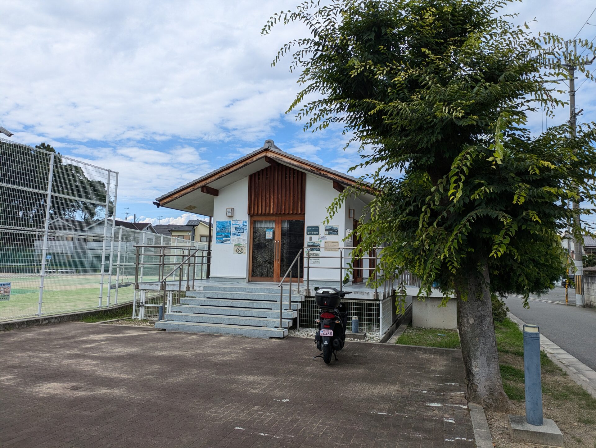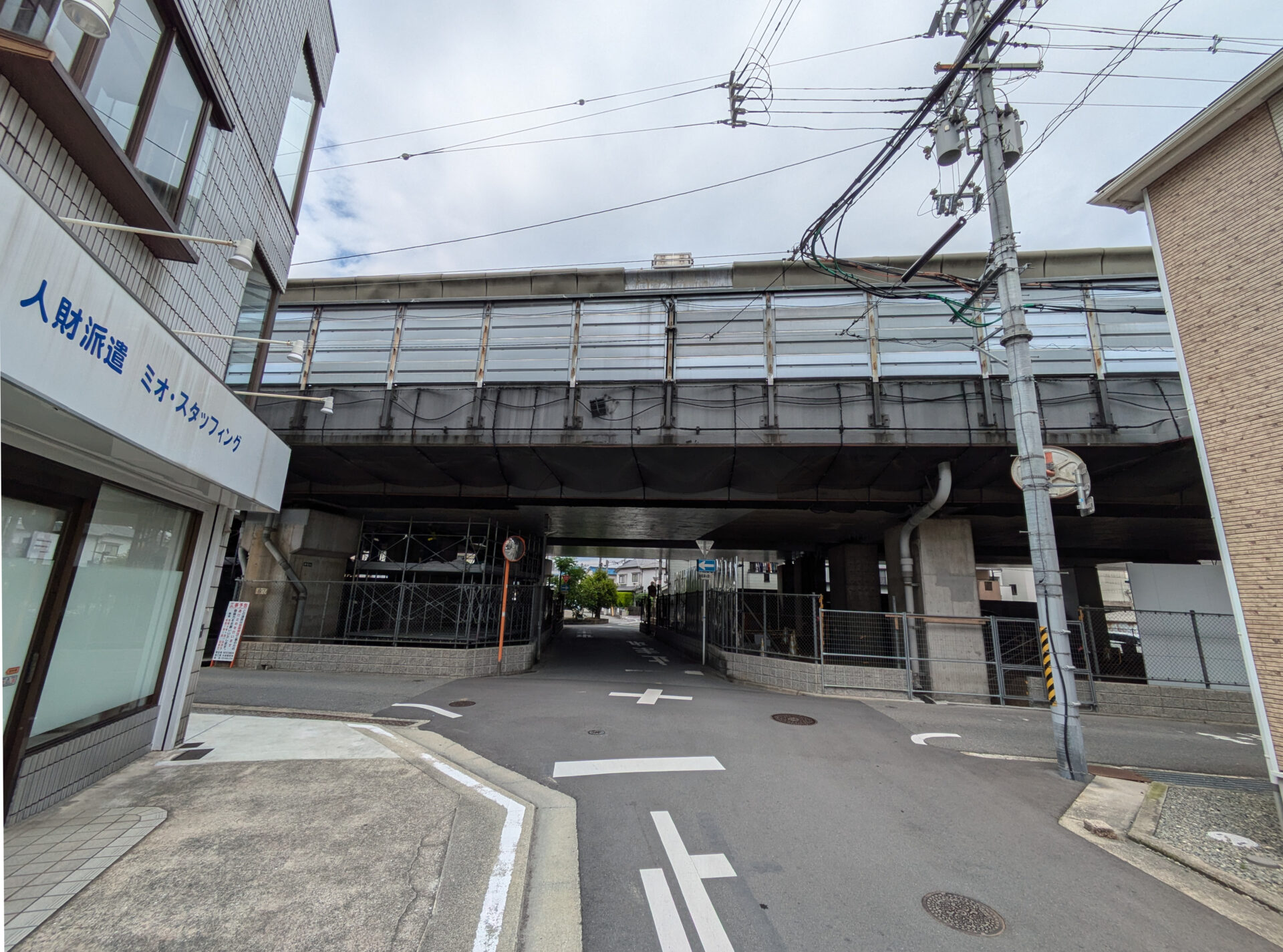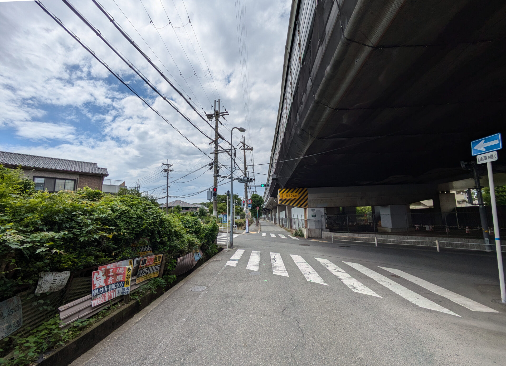 途中、テニスコートのグランドを通り過ぎ直進していきますと、頭上に高速道路が見えましたら左折いただき、高速道路の下に沿って進んでいきます。