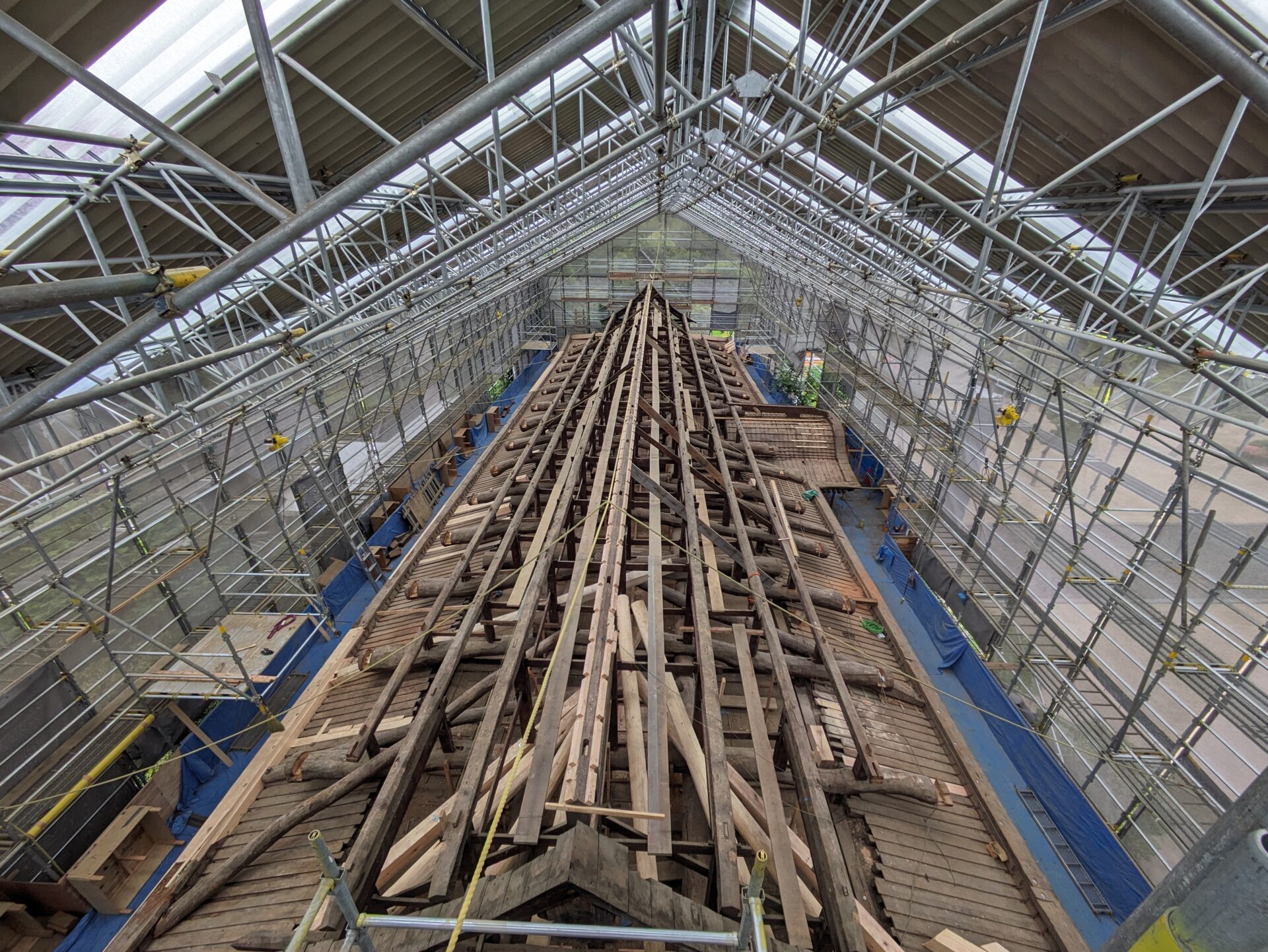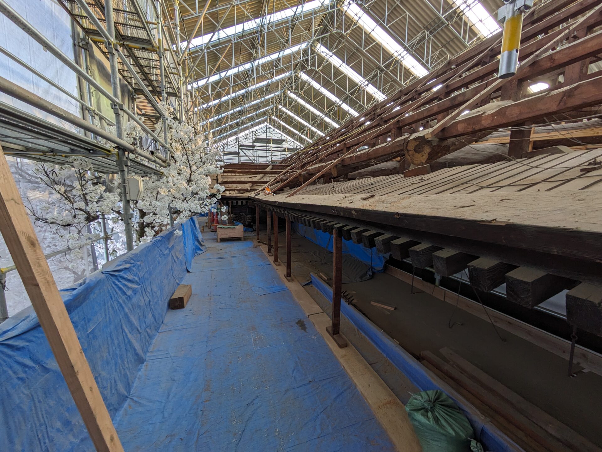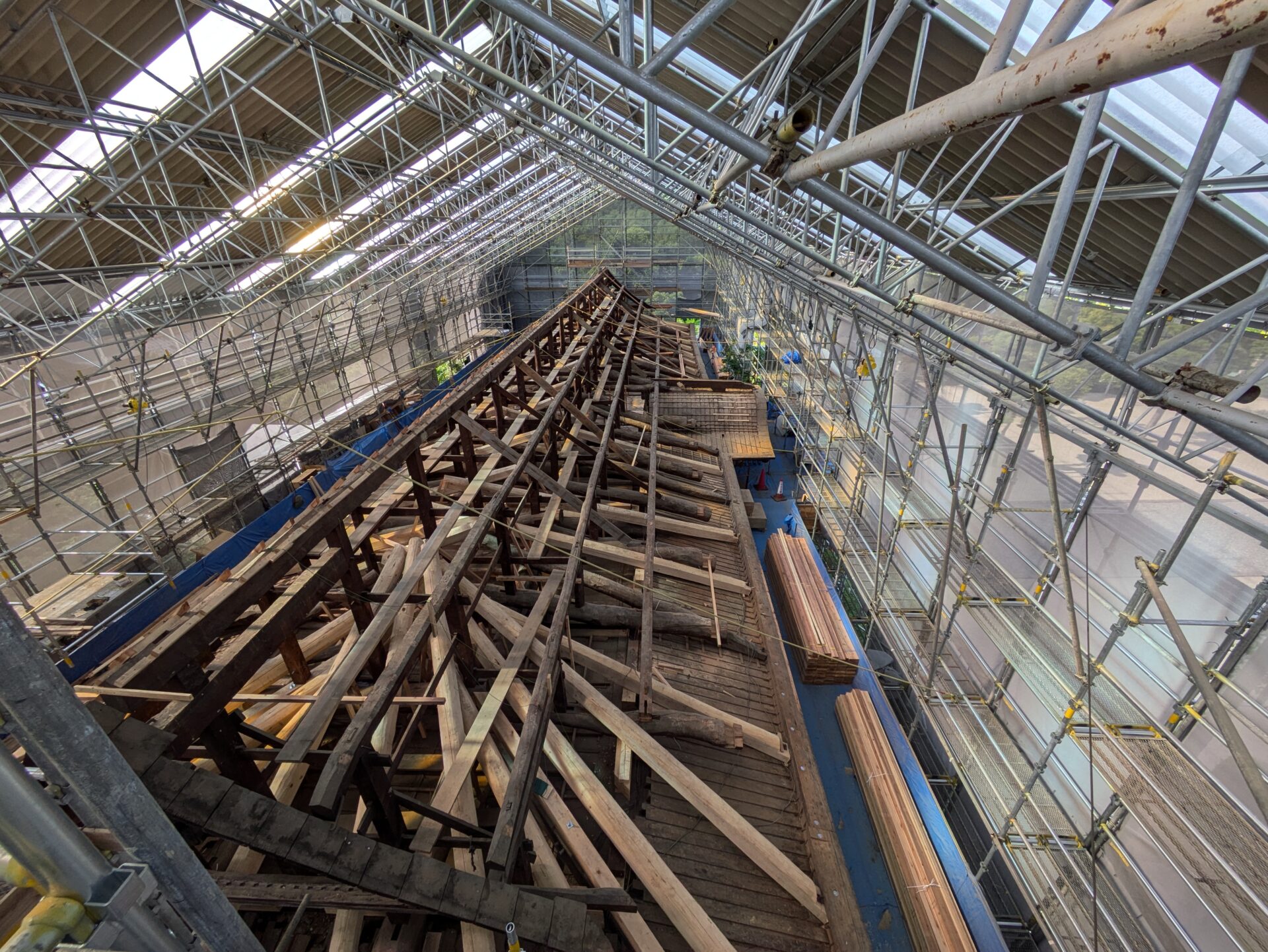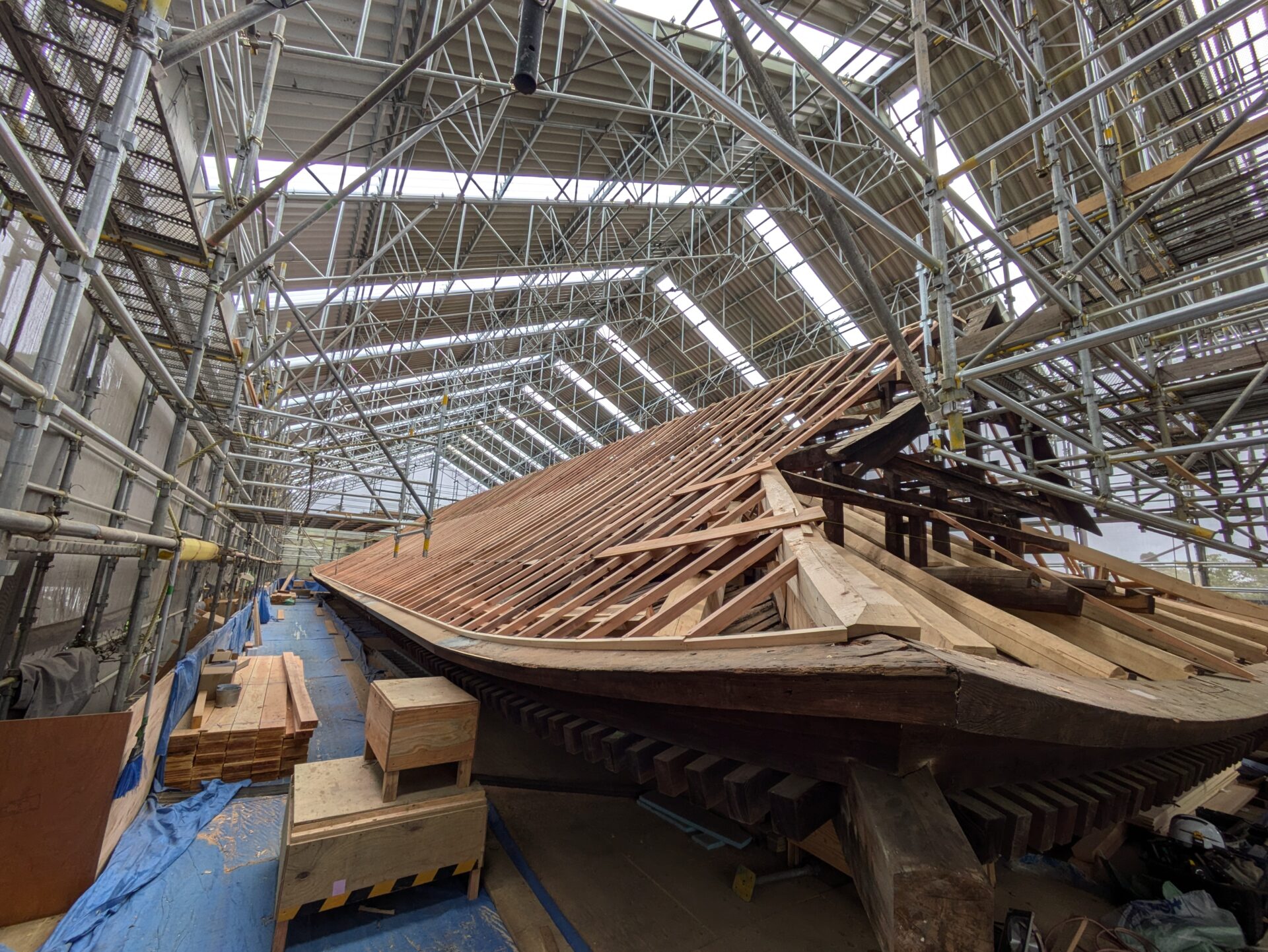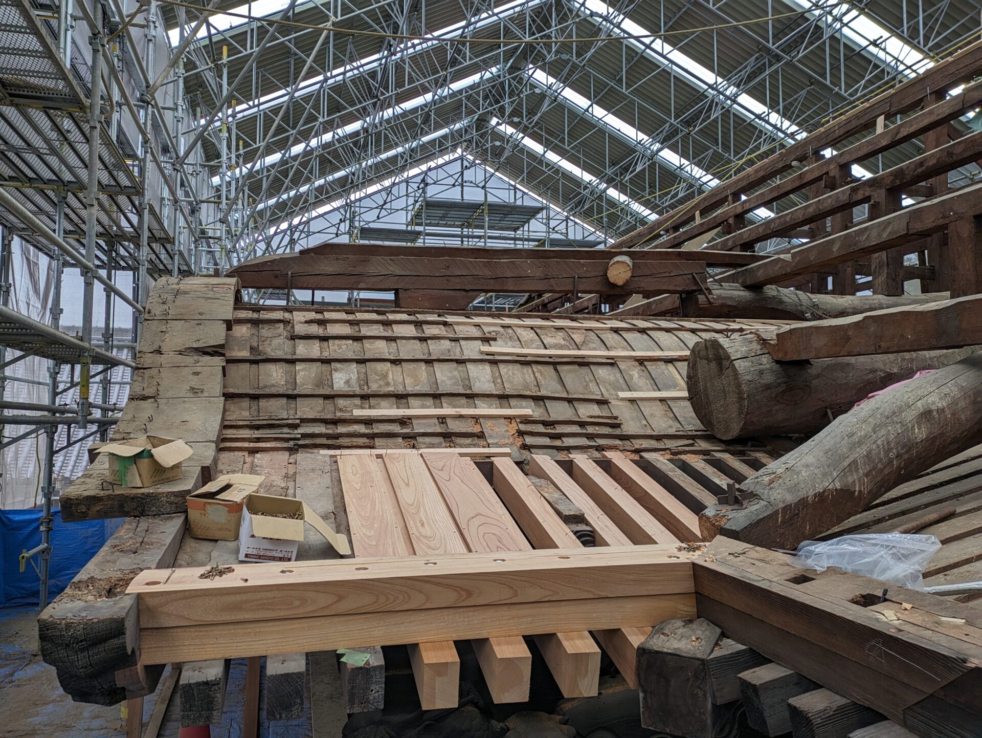 4月初めには、早くも補修の工程である木部分の工事に進みました。7日の時点では、屋根の軒を支えるつっかえ棒の様な補助柱が設置されていました。こちらは、おそらく取り外した垂木の部分を再利用したものだと思います。