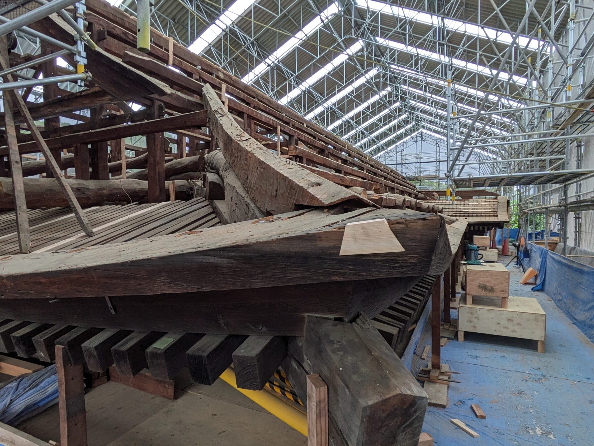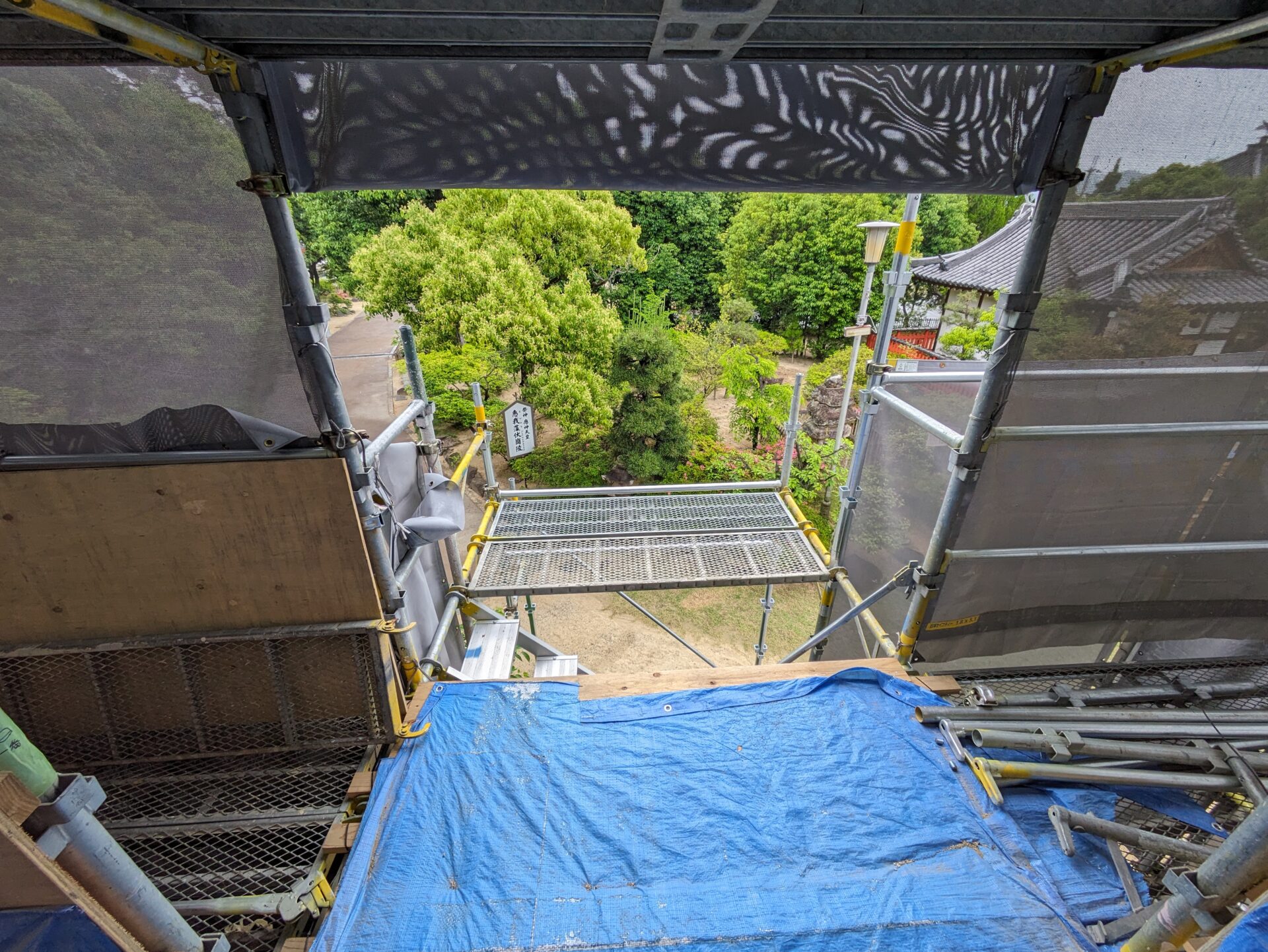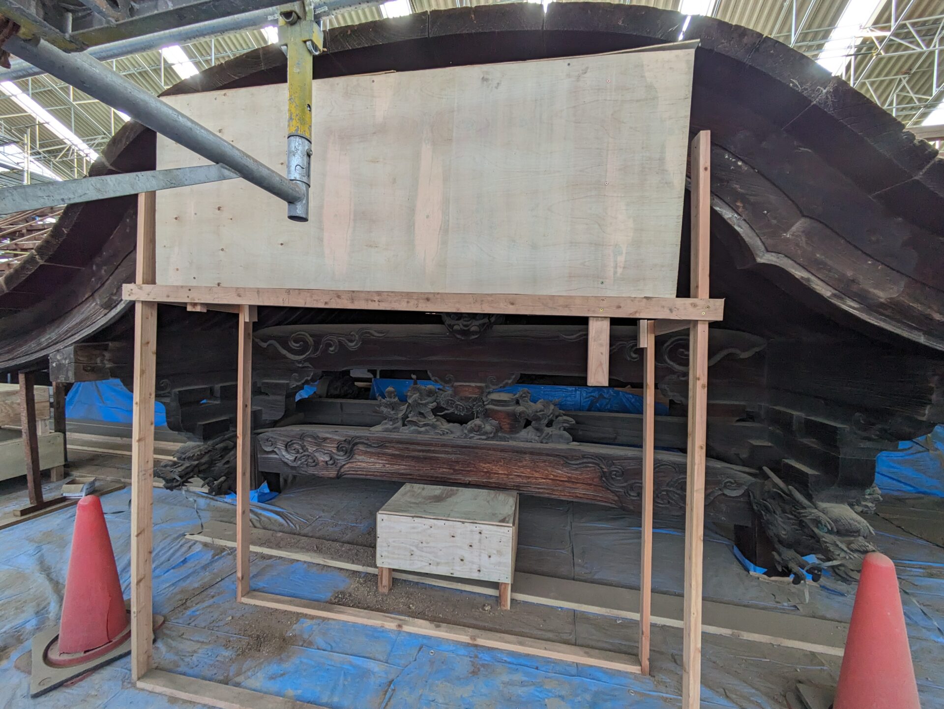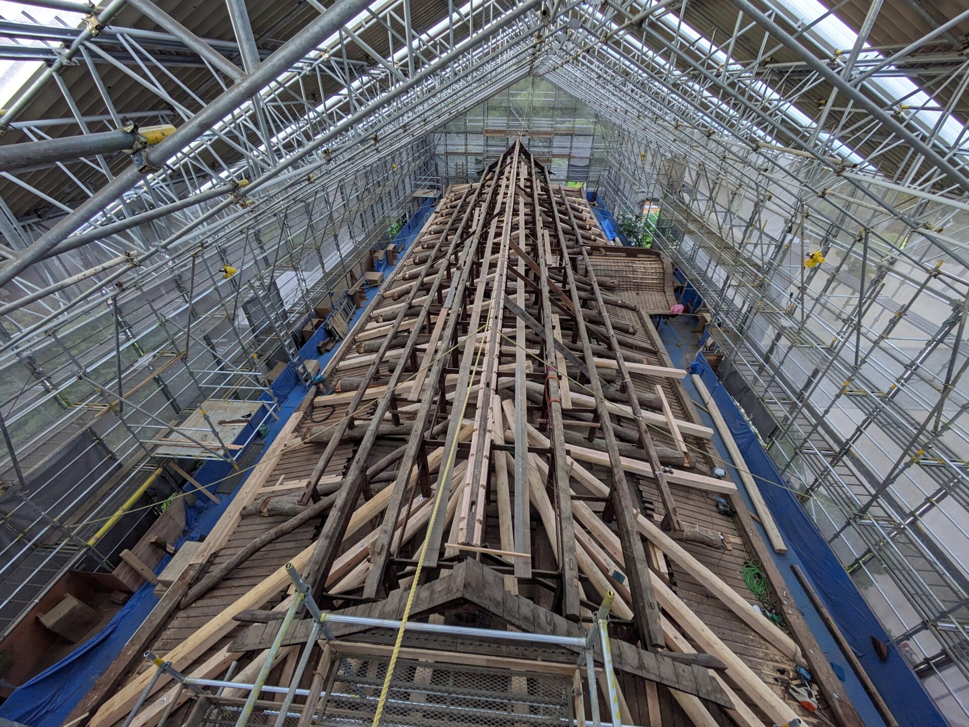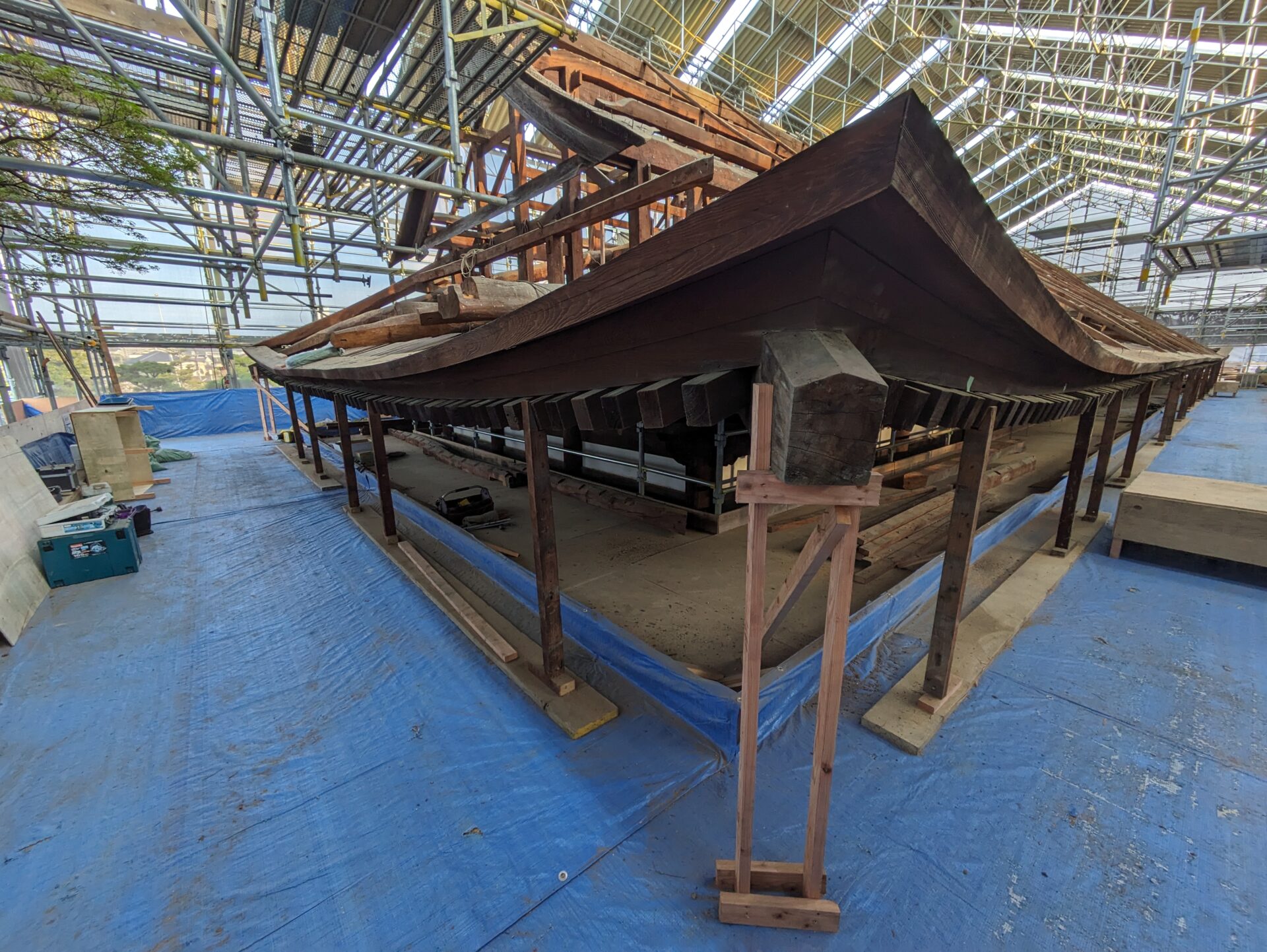 4月初めには、早くも補修の工程である木部分の工事に進みました。7日の時点では、屋根の軒を支えるつっかえ棒の様な補助柱が設置されていました。こちらは、おそらく取り外した垂木の部分を再利用したものだと思います。