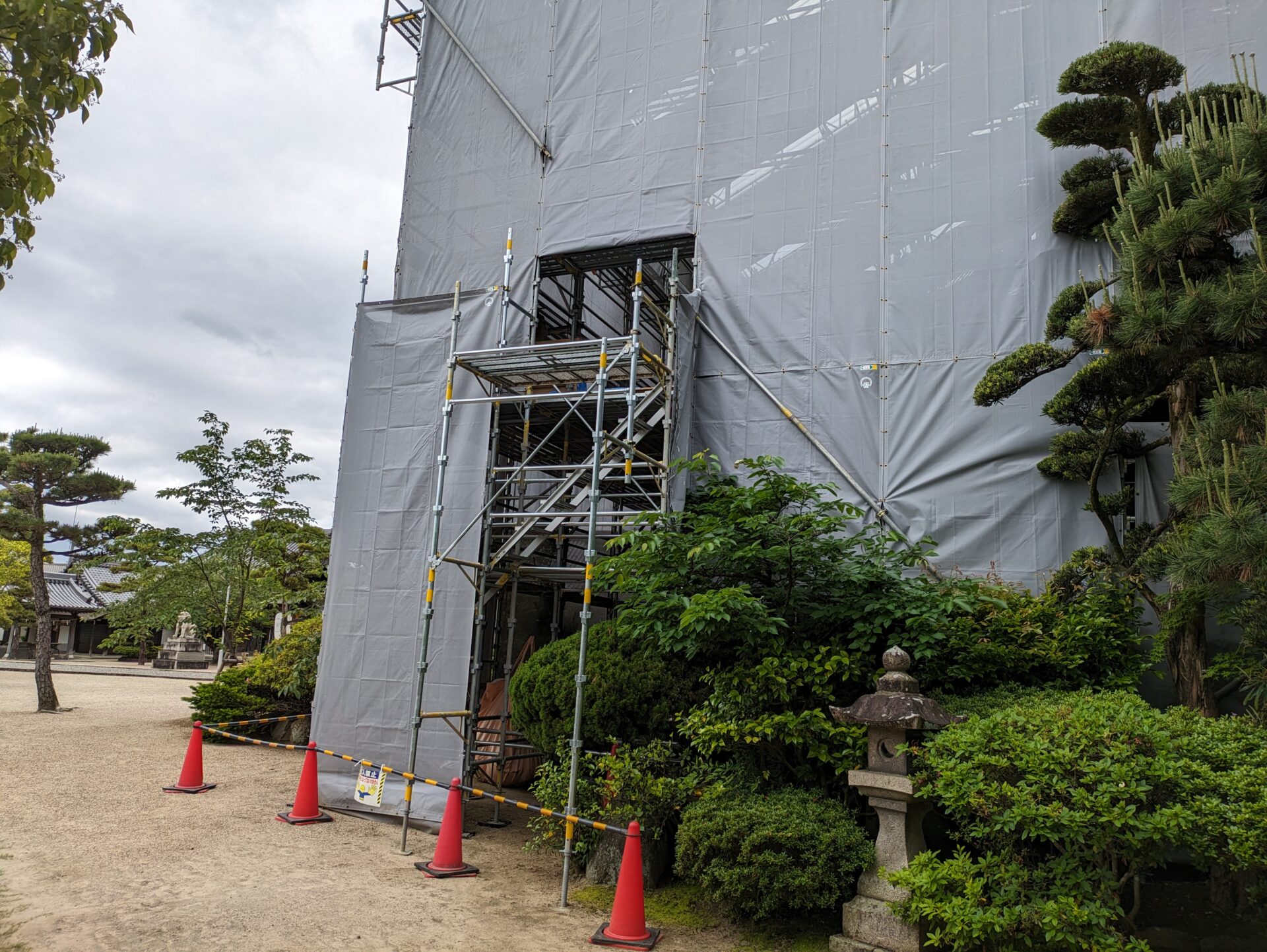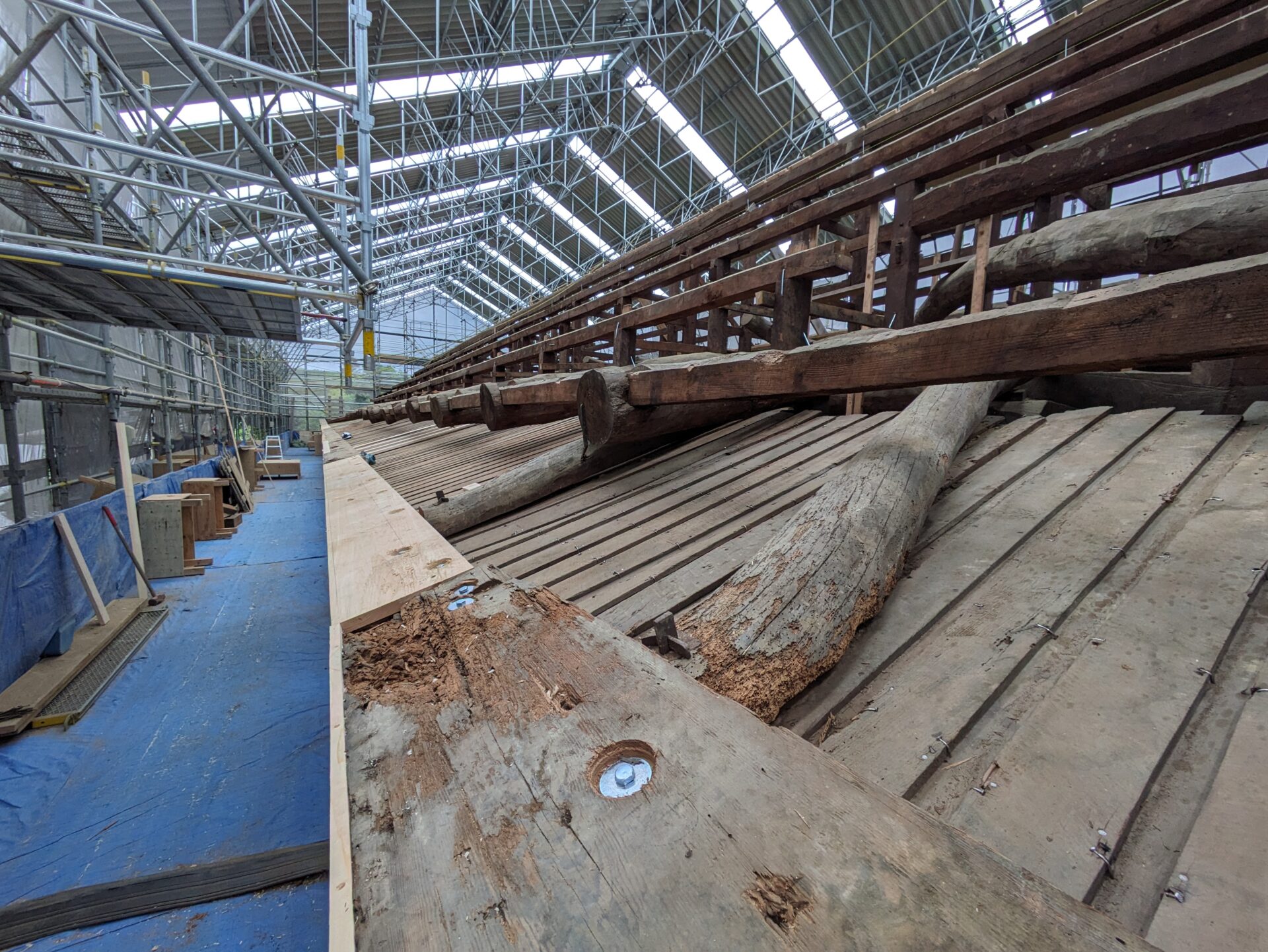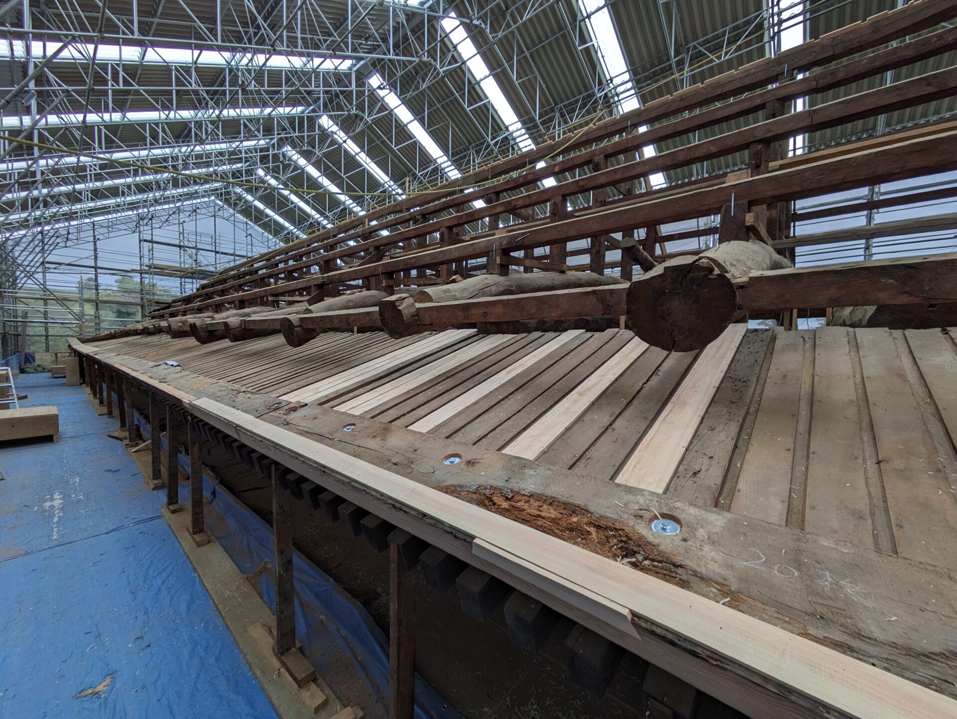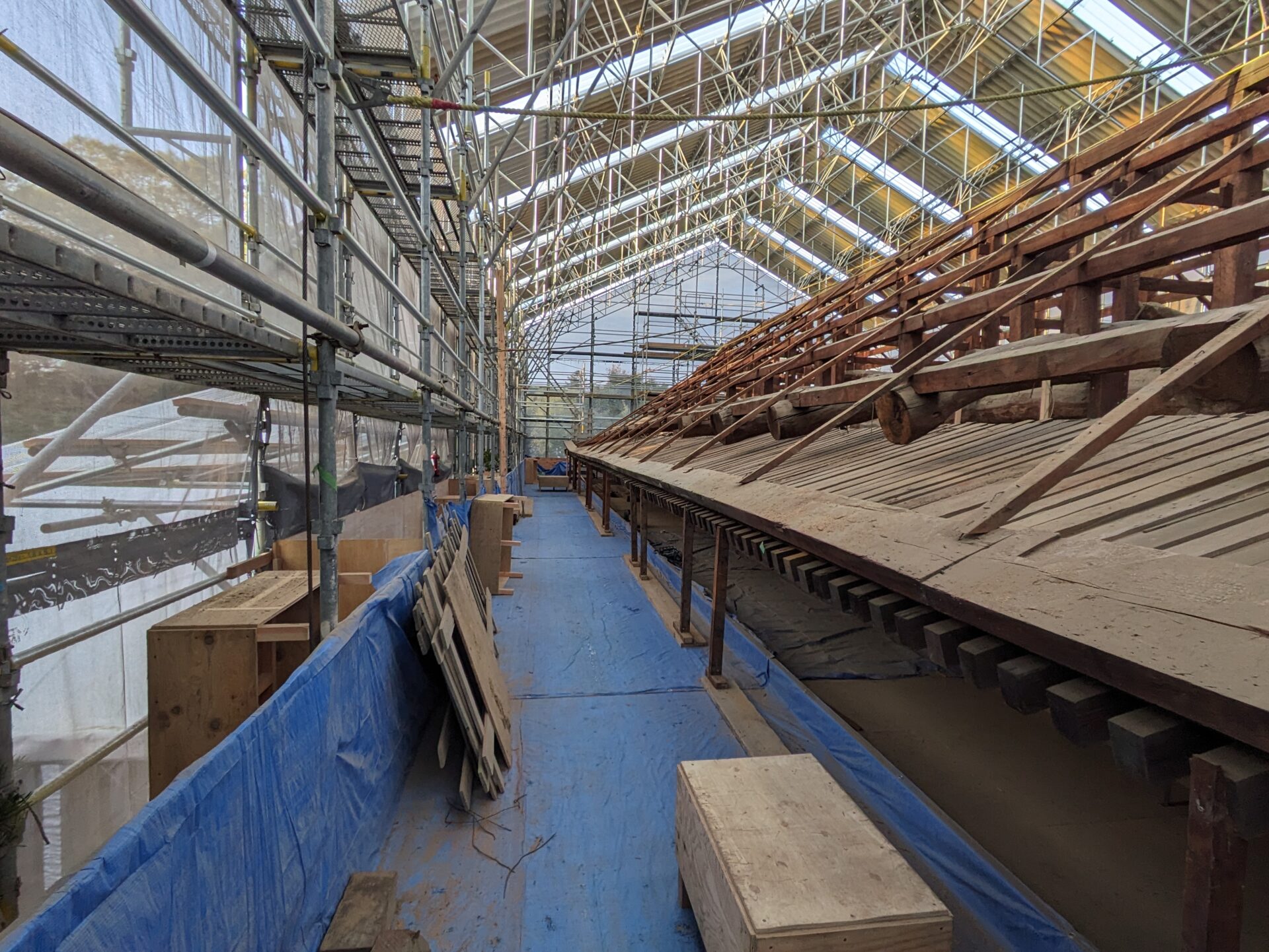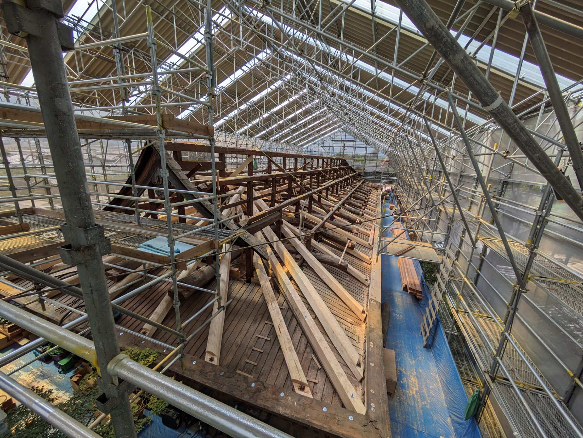 4月初めには、早くも補修の工程である木部分の工事に進みました。7日の時点では、屋根の軒を支えるつっかえ棒の様な補助柱が設置されていました。こちらは、おそらく取り外した垂木の部分を再利用したものだと思います。