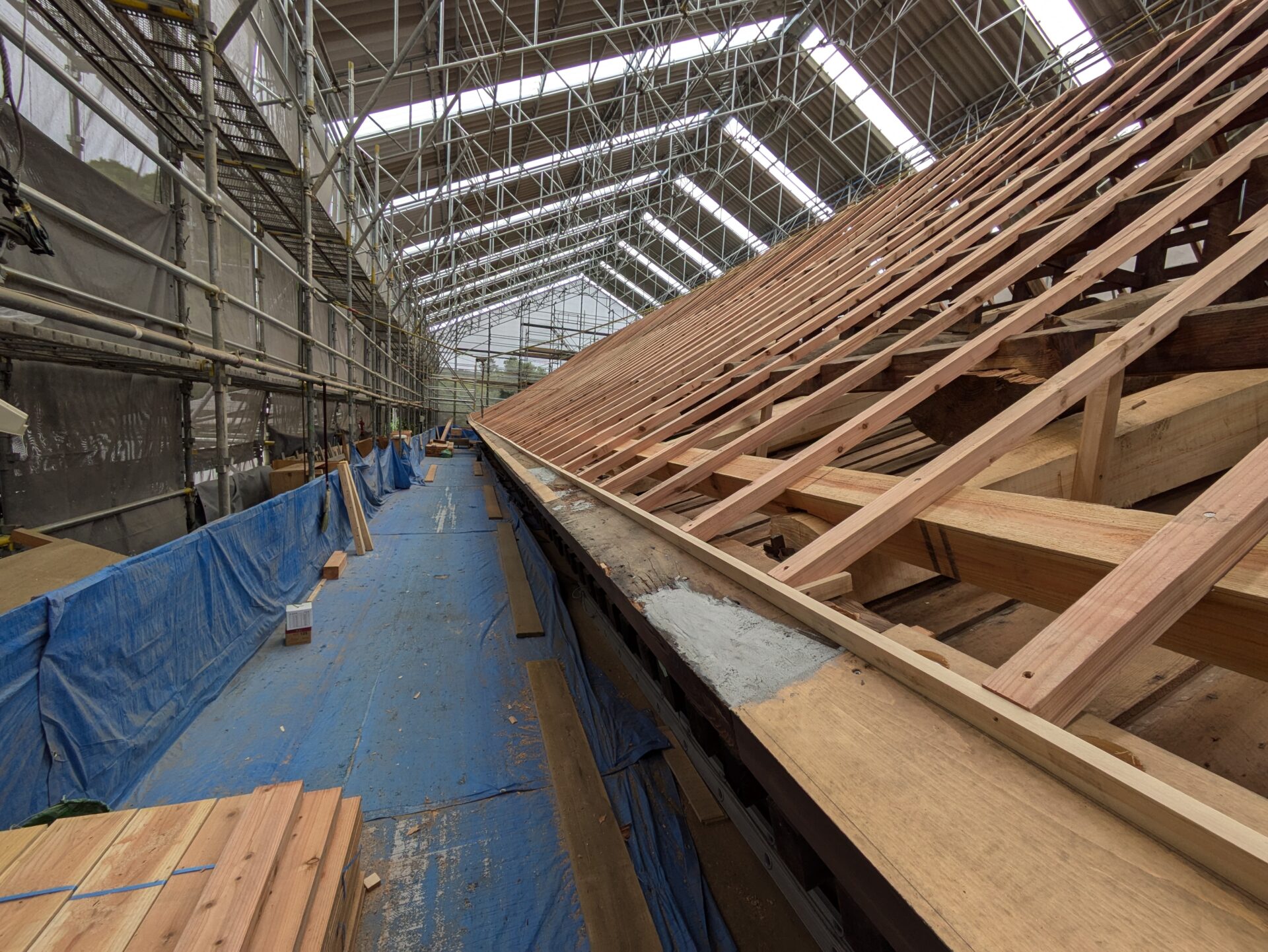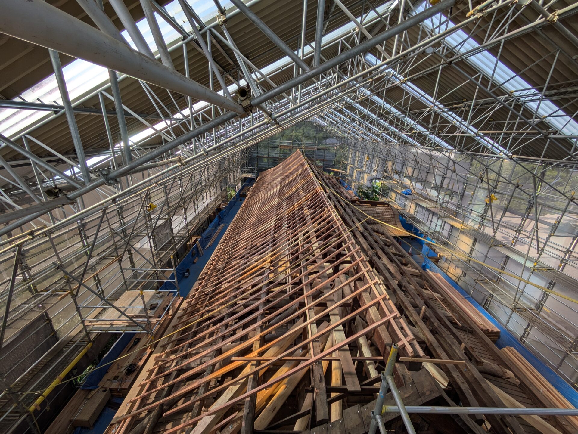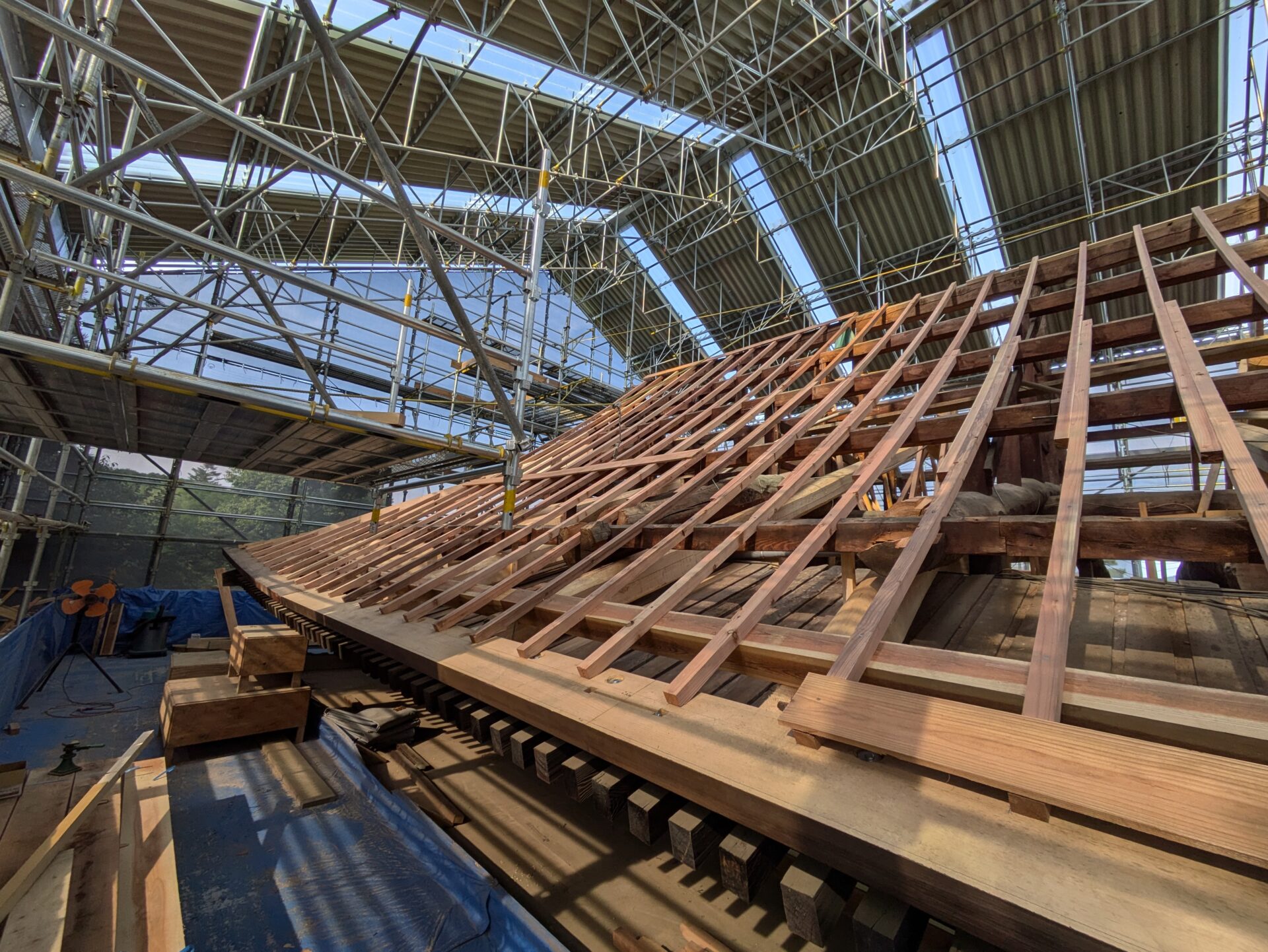 桔木の設置が終わると、次は瓦を乗せる野地板を支える垂木を設置する工程になりました。木材が新しくなり、垂木の設置が進んでいきますときっちりと均整が取れて綺麗だなと思いました。