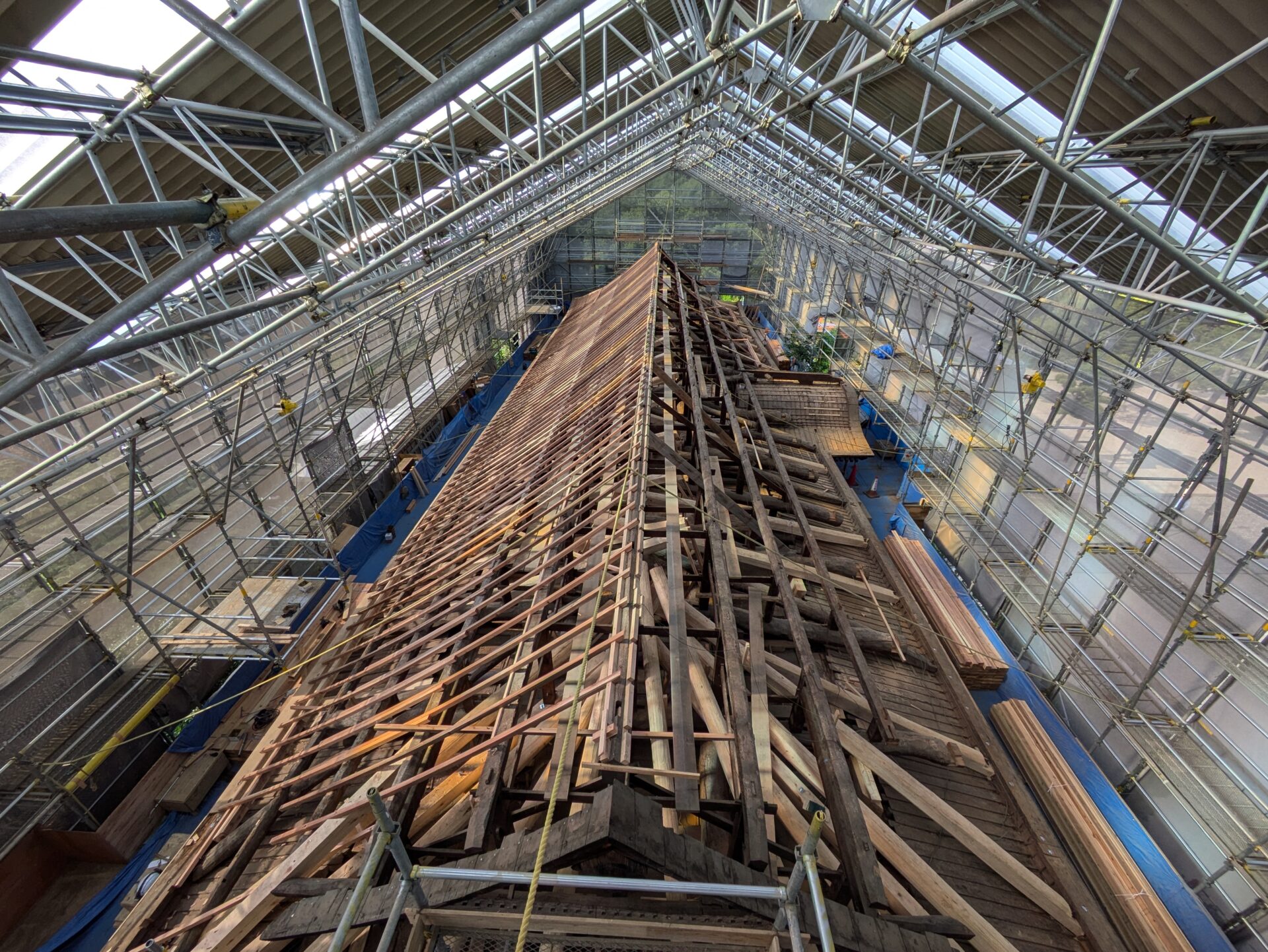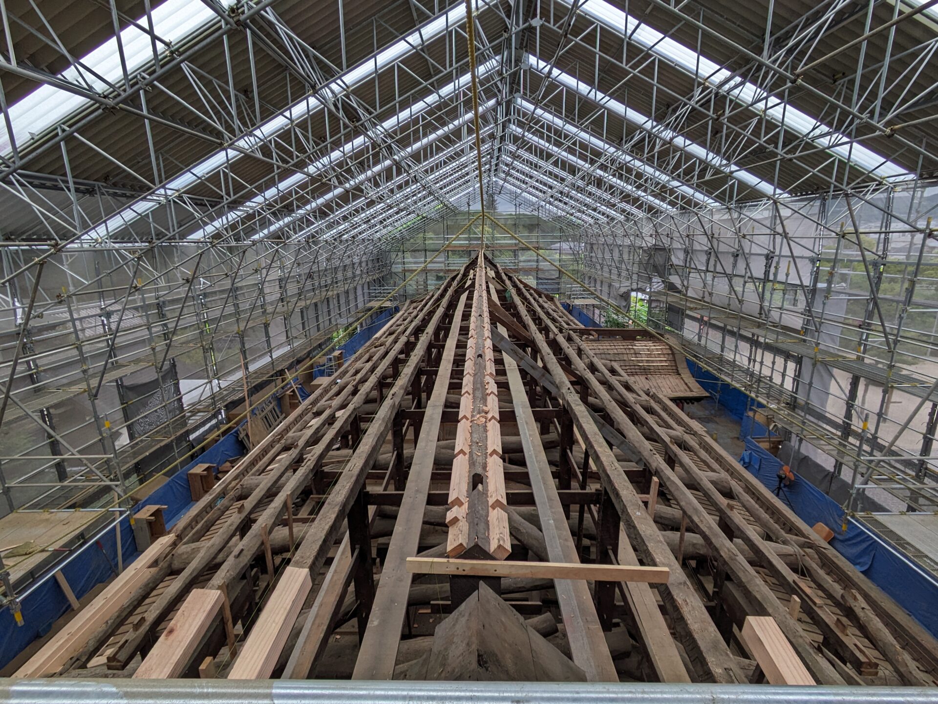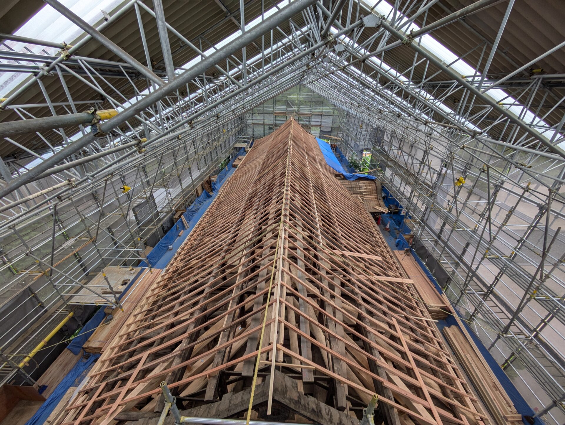 桔木の設置が終わると、次は瓦を乗せる野地板を支える垂木を設置する工程になりました。木材が新しくなり、垂木の設置が進んでいきますときっちりと均整が取れて綺麗だなと思いました。